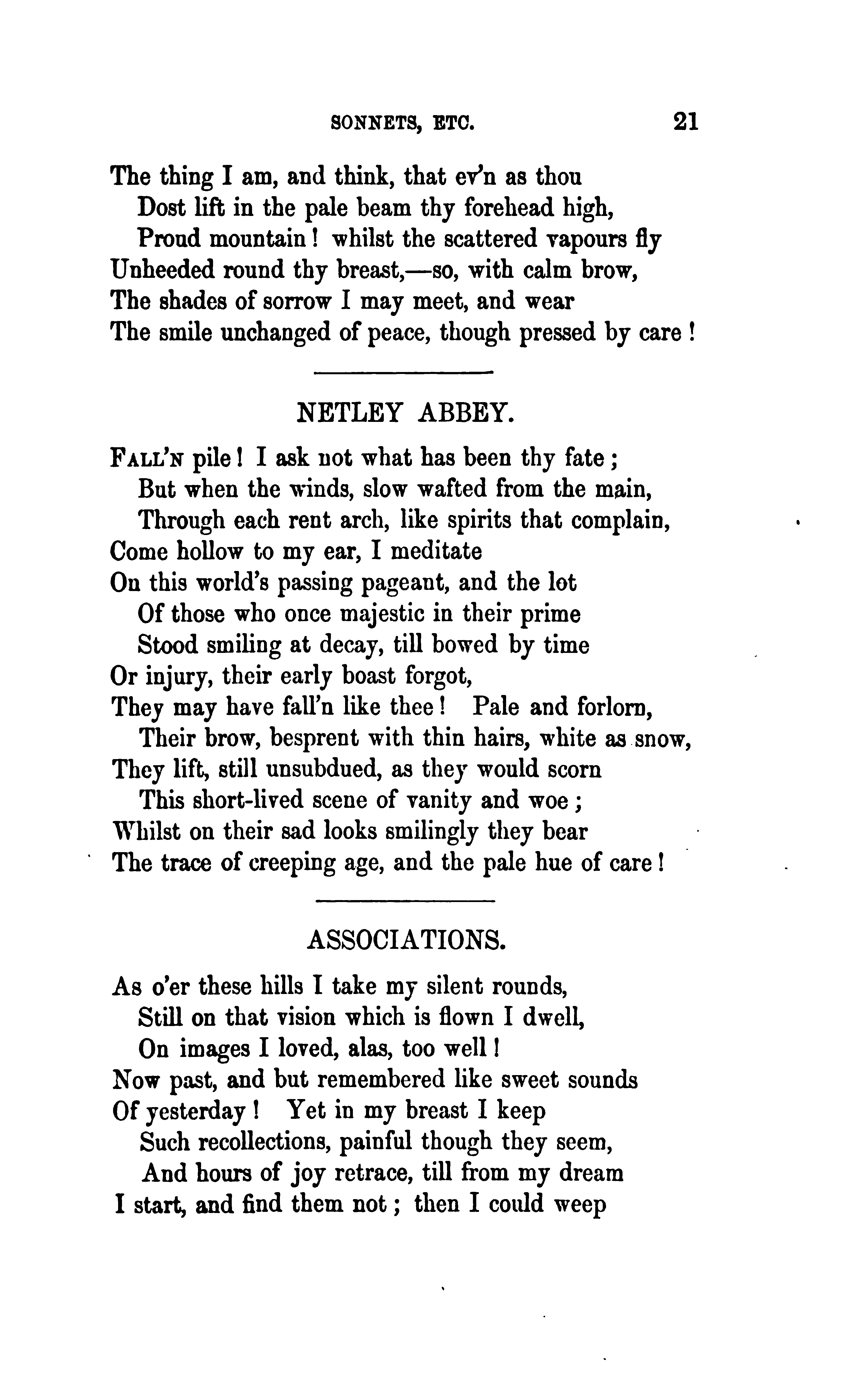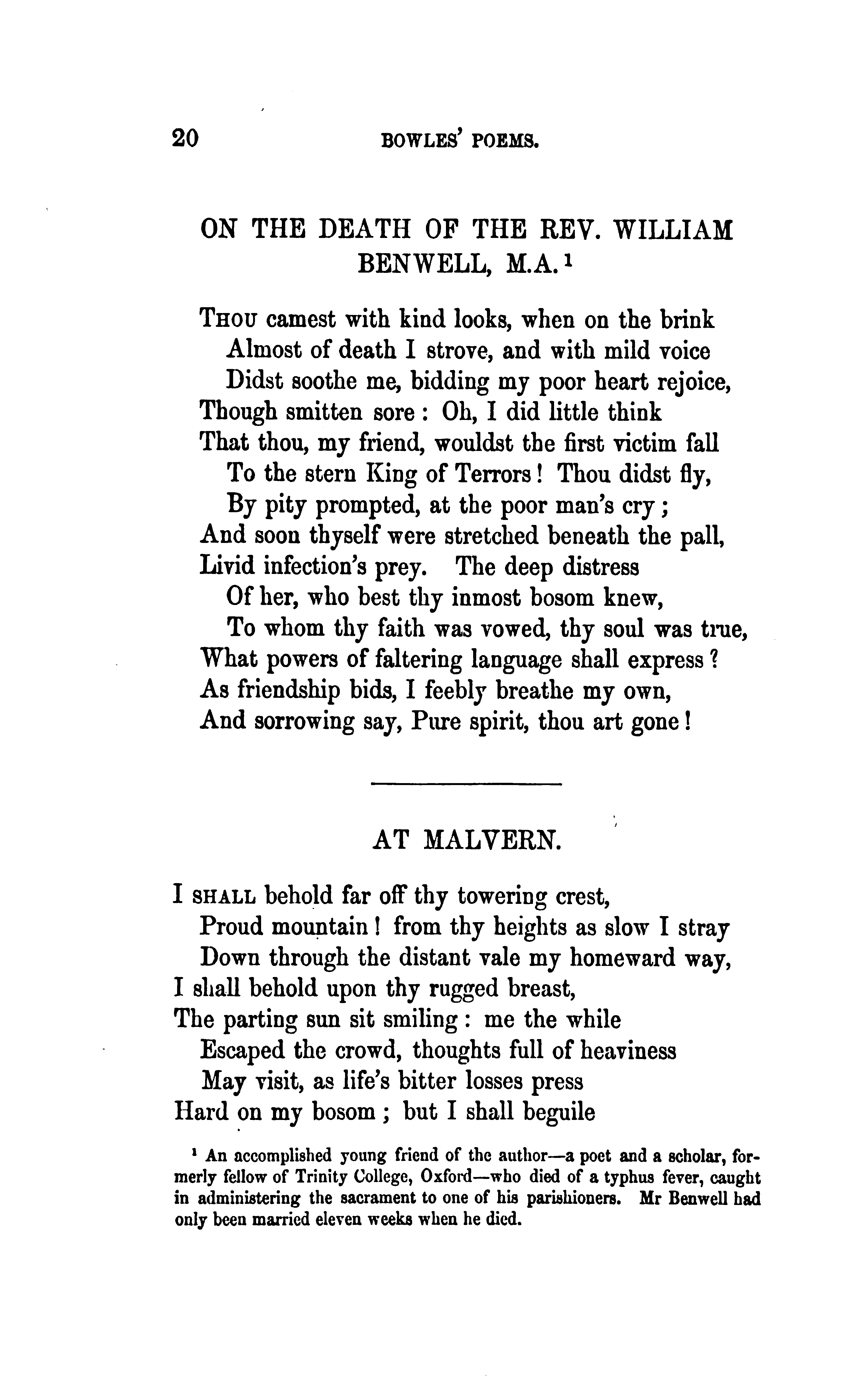 Bowles, William Lisle, 1762-1850. The Poetical Works of William Lisle Bowles, Vol. I. With Memoir, Critical Dissertation, and Explanatory Notes by George Gilfillan. Edinburgh: James Nichol, 9 North Bank Street..., 1855, pp. 20-21. (Page images digitized from a copy held at the University of California Libraries.)
