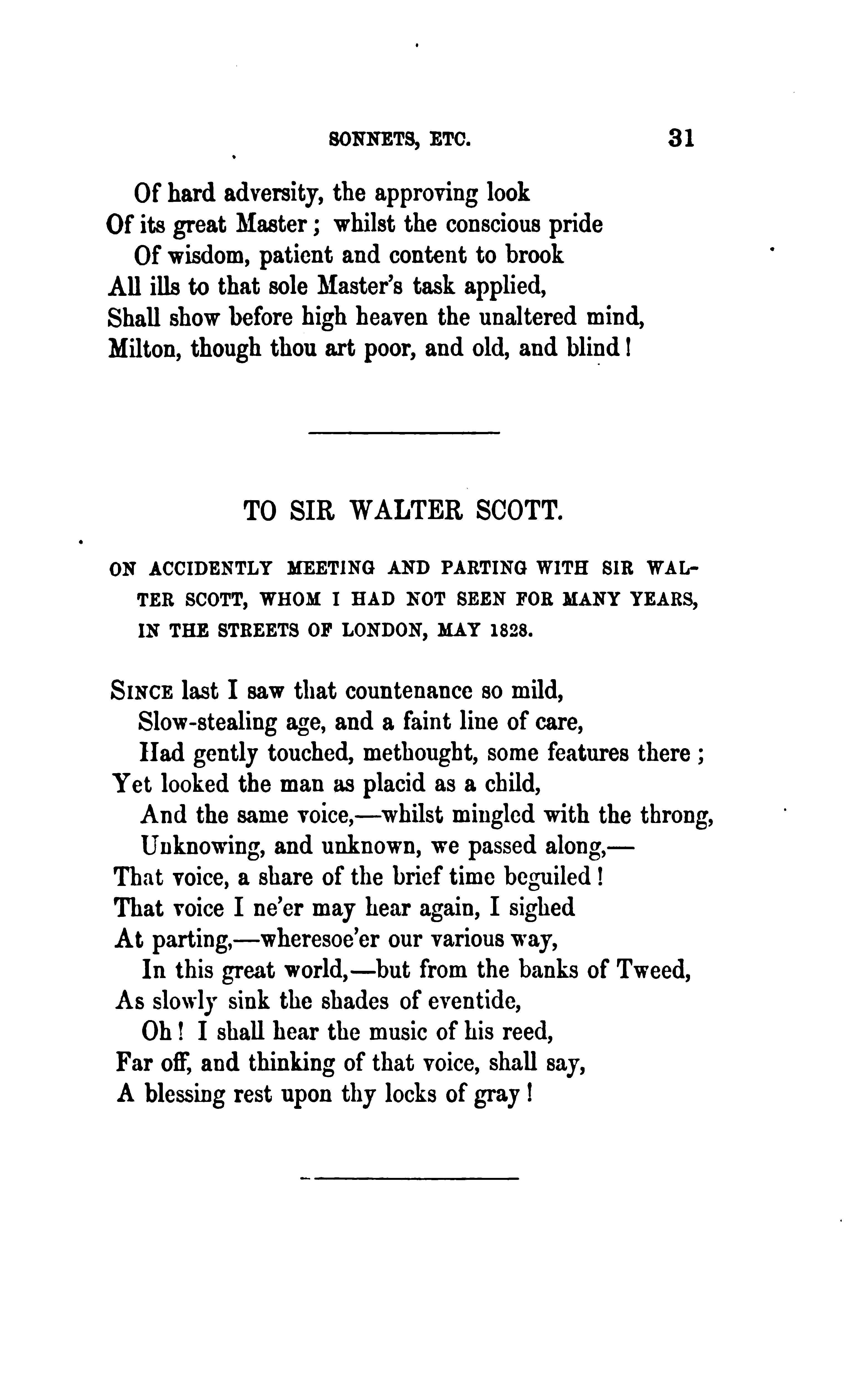 - TO SIR WALTER SCOTT. ON ACCIDENTLY MEETING AND PARTING WITH SIR WALTER SCOTT, WHOM I HAD NOT SEEN FOR MANY YEARS, IN THE STREETS OF LONDON, MAY 1828. ()