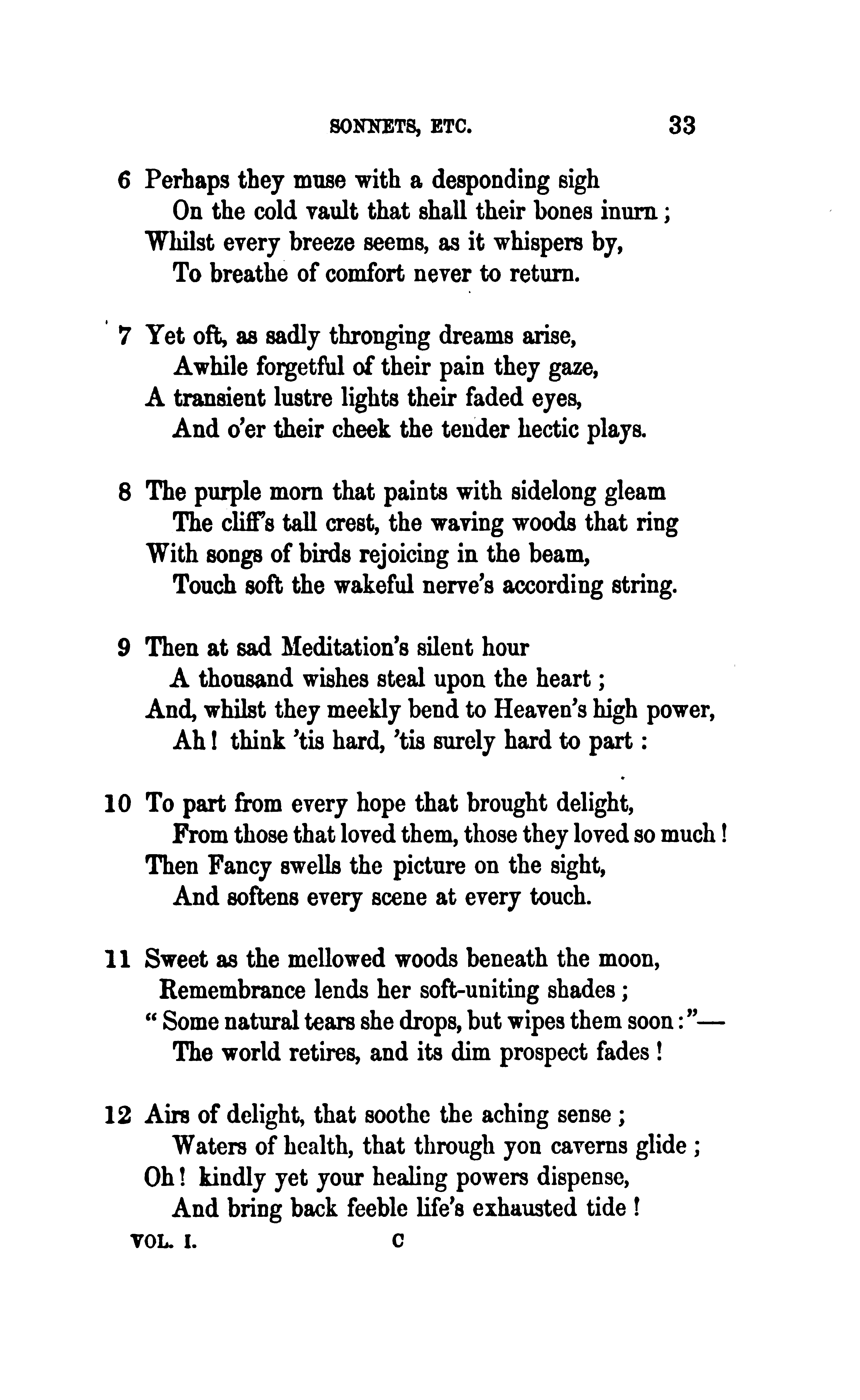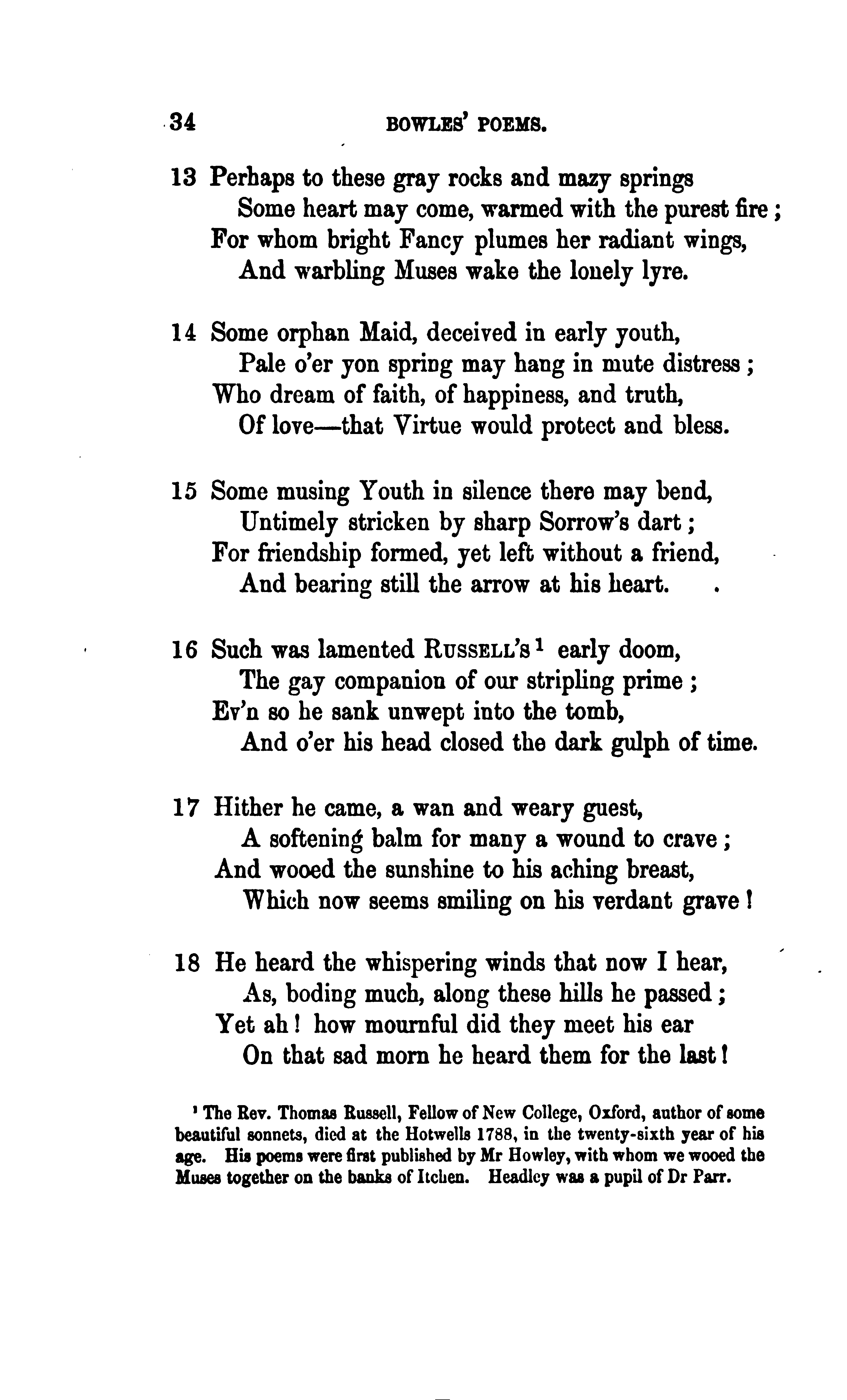 19 The Rev. Thomas Russell, Fellow of New College, Oxford, author of some beautiful sonnets, died at the Hotwells 1788, in the twenty-sixth year of his age. His poems were first published by Mr Howley, with whom we wooed the Muses together on the banks of Itchen. Headley was a pupil of Dr Parr.
