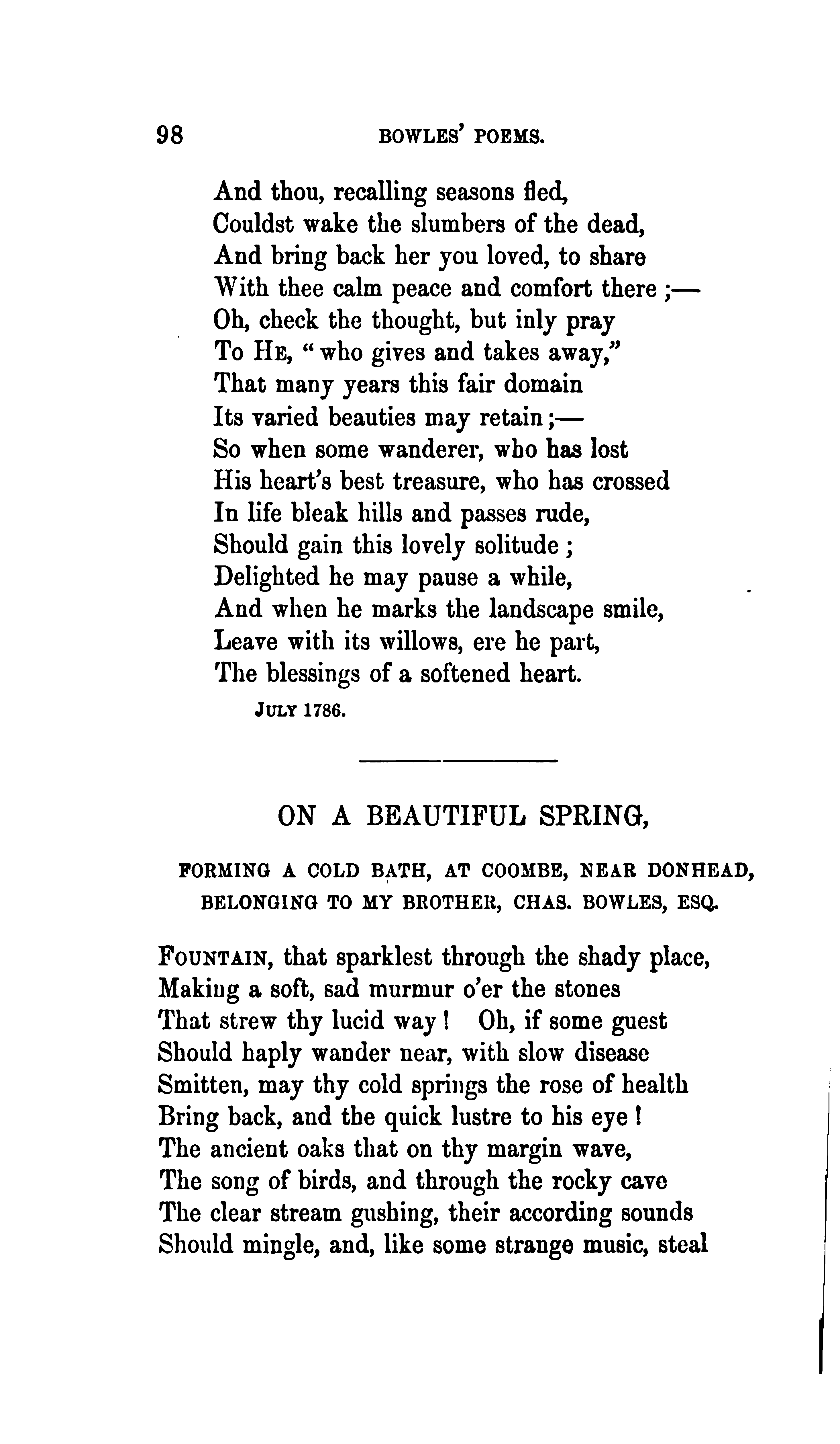 Bowles, William Lisle, 1762-1850. The Poetical Works of William Lisle Bowles, Vol. I. With Memoir, Critical Dissertation, and Explanatory Notes by George Gilfillan. Edinburgh: James Nichol, 9 North Bank Street..., 1855, pp. 98-99. (Page images digitized from a copy held at the University of California Libraries.)