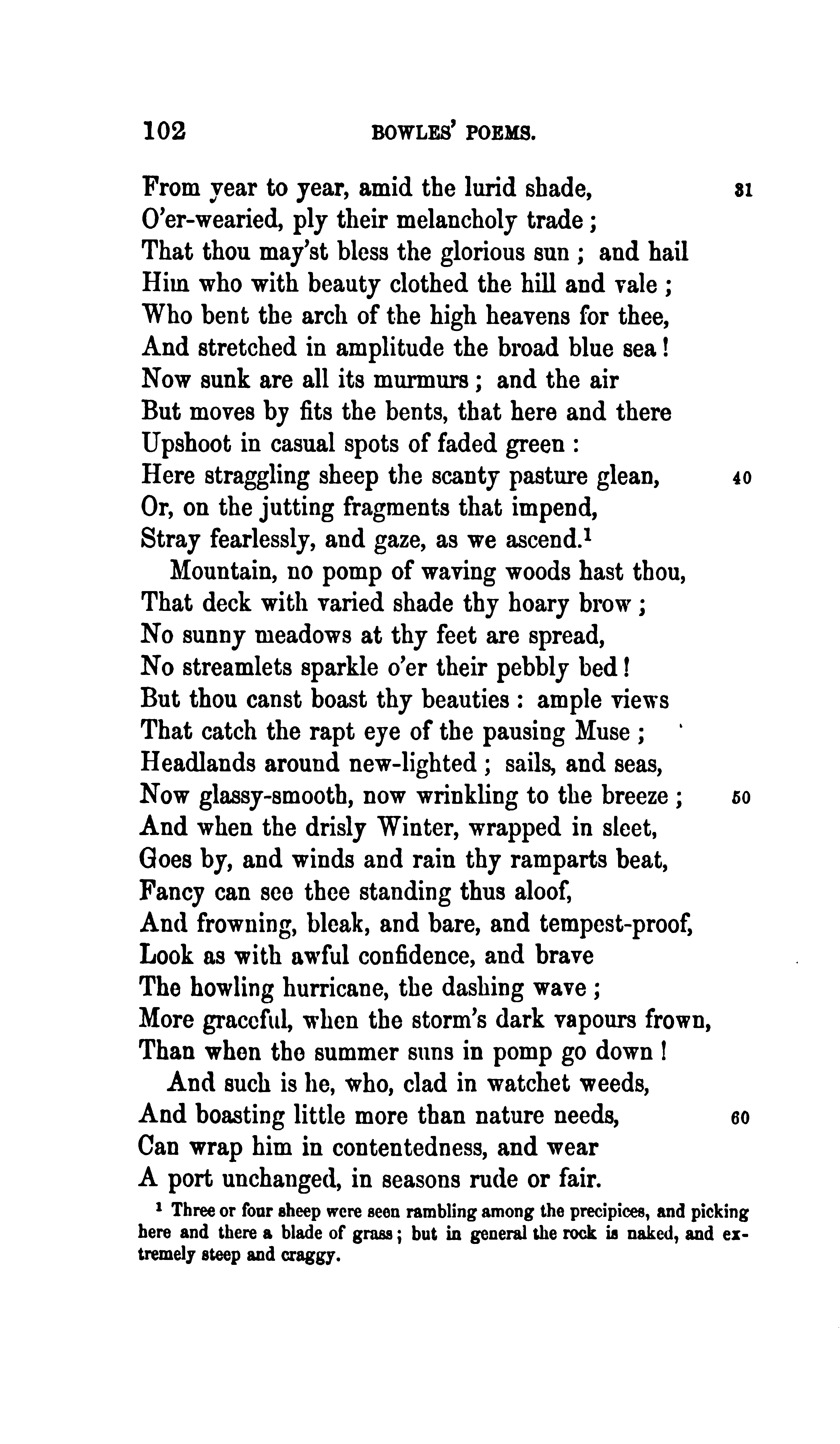 55 Three or four sheep were seen rambling among the precipices, and picking here and there a blade of grass; but in general the rock is naked, and extremely steep and craggy.