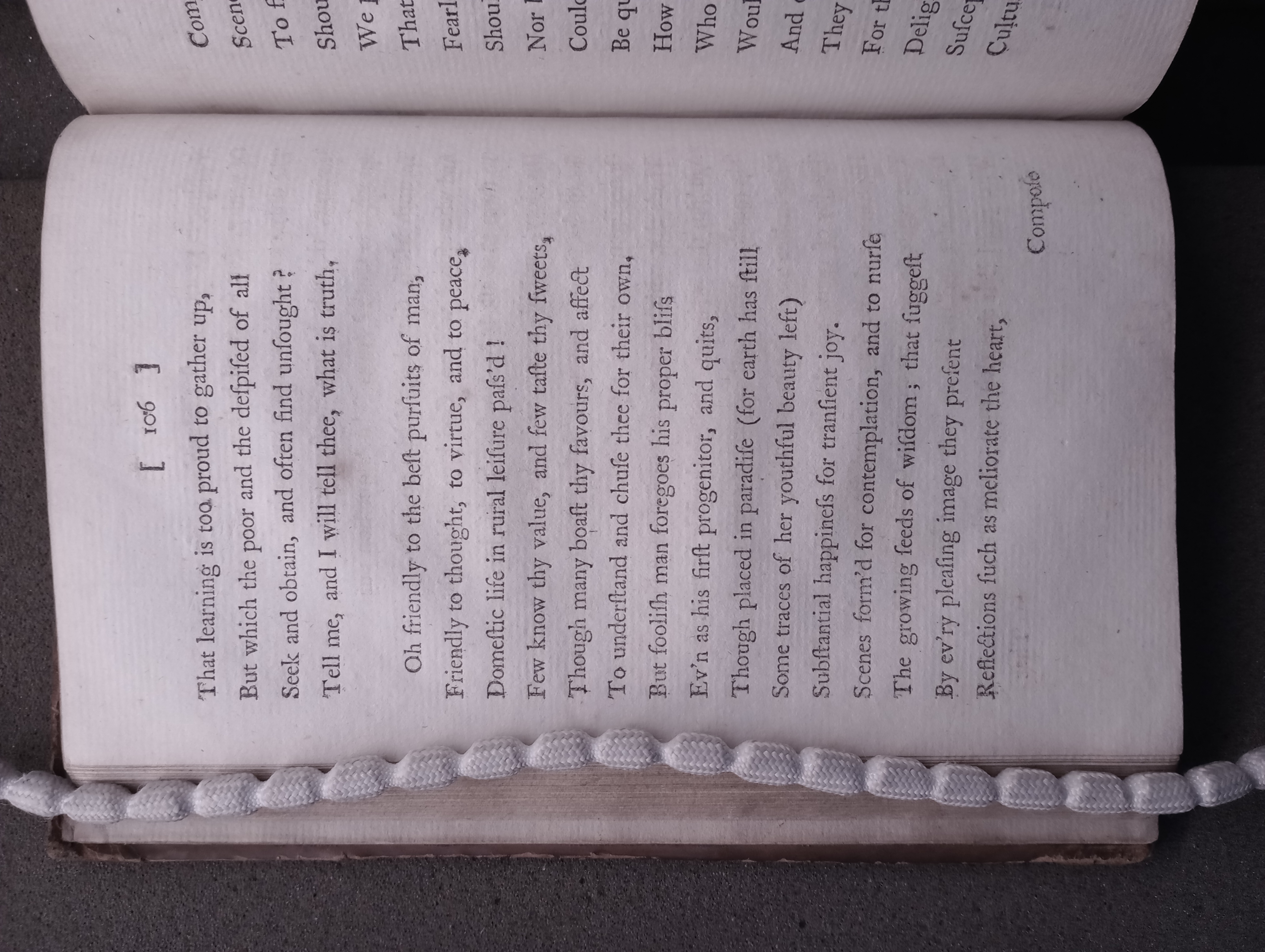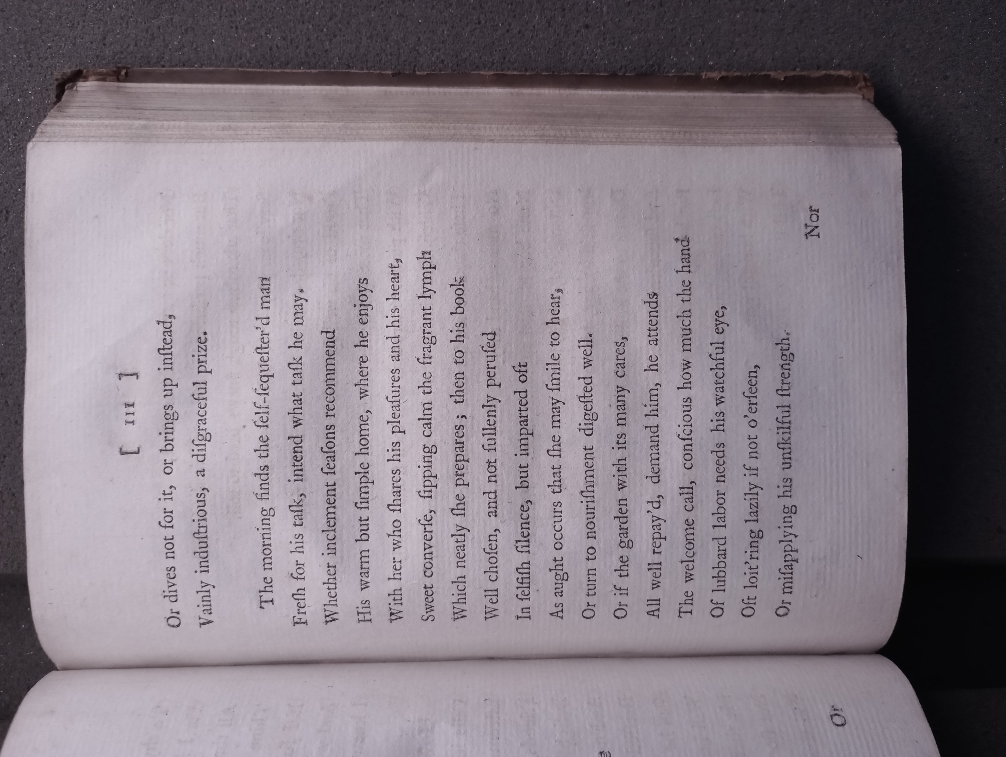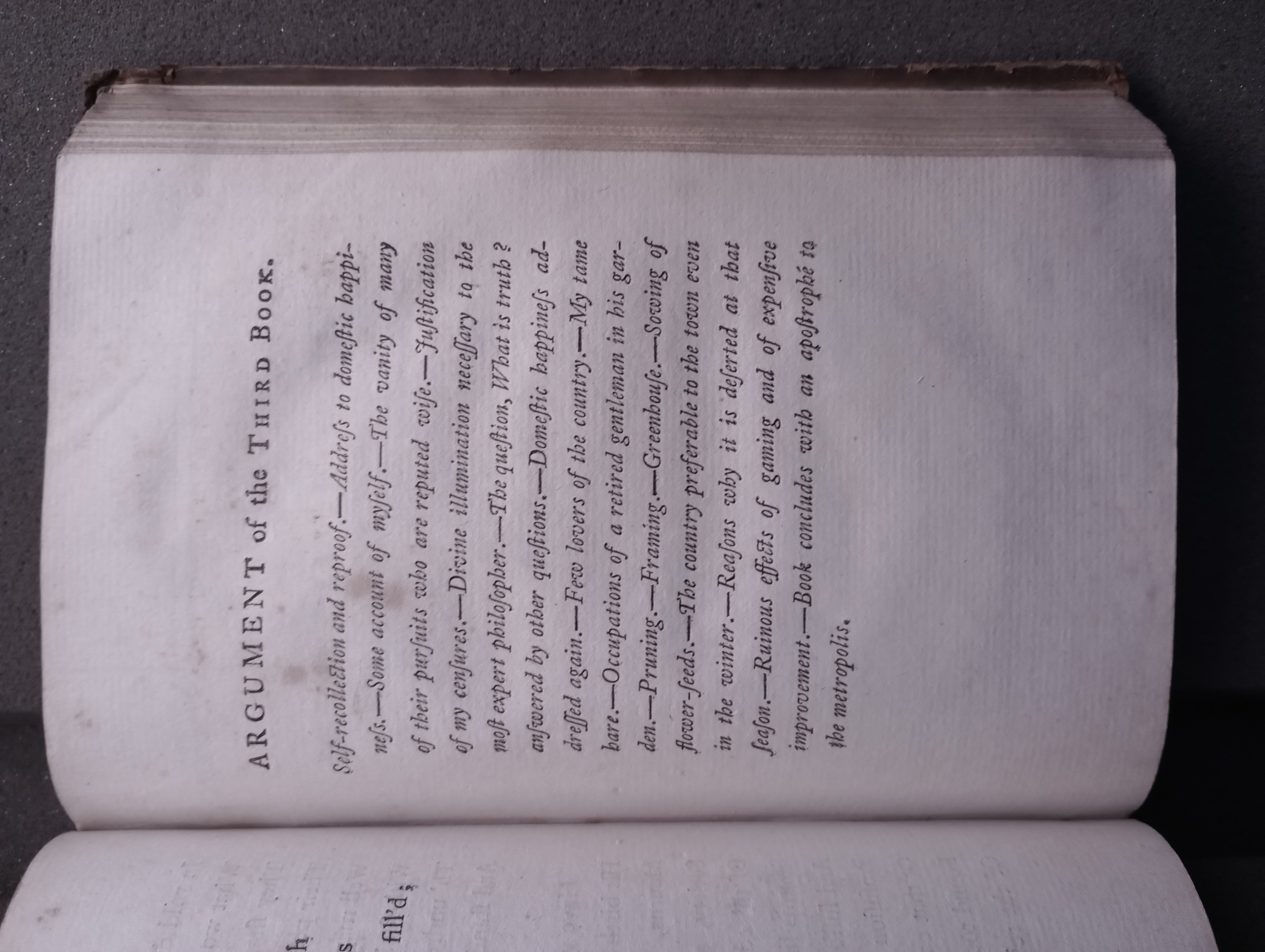 Self-recollection and reproof. — Address to domestic happiness. — Some account of myself. — The vanity of many of their pursuits who are reputed wise. — Justification of my censures. — Divine illumination necessary to the most expert philosopher. — The question, What is truth? answered by other questions. — Domestic happiness addressed again. — Few lovers of the country. — My tame hare. — Occupations of a retired gentleman in his garden. — Pruning. — Framing. — Greenhouse. — Sowing of flower-seeds. — The country preferable to the town even in the winter. — Reasons why it is deserted at that season. — Ruinous effects of gaming and of expensive improvement. — Book concludes with an apostrophé to the metropolis.