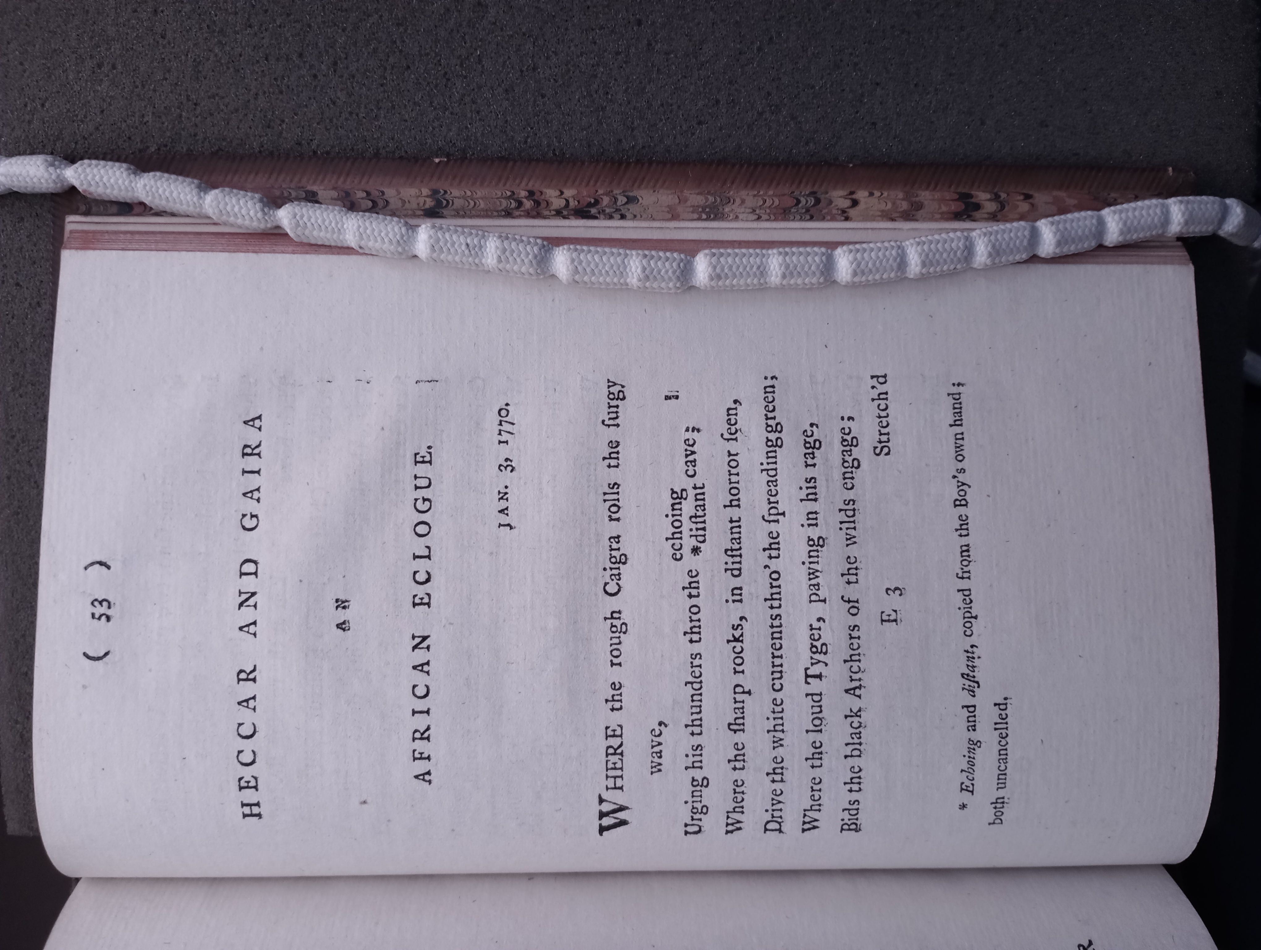 Chatterton, Thomas, 1752-1770. A Supplement to the Miscellanies of Thomas Chatterton London: printed for T. Becket, in Pall-Mall; Bookseller to His Royal Highness the Prince of Wales, and Their Royal Highnesses the Princes. MDCCLXXXIV., 1784, pp. 53-59. [6],ii,88p.; 8⁰. (ESTC T48948; OTA K045459.000) (Page images digitized from a copy in the Bodleian Library [Harding C 696 (1)].)