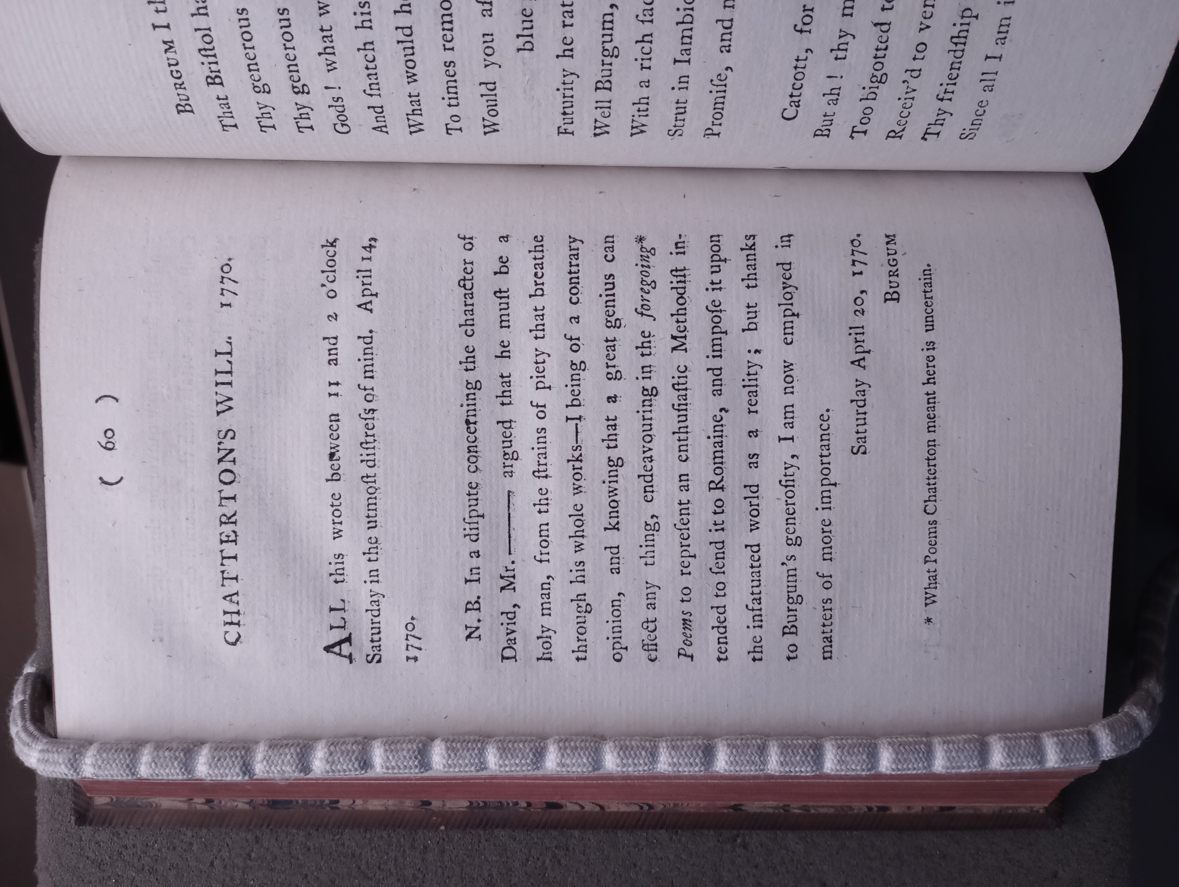 N. B. In a dispute concerning the character of David, Mr. — argued that he must be a holy man, from the strains of piety that breathe through his whole works — I being of a contrary opinion, and knowing that a great genius can effect any thing, endeavouring in the foregoing** What Poems Chatterton meant here is uncertain. Poems to represent an enthusiastic Methodist intended to send it to Romaine, and impose it upon the infatuated world as a reality; but thanks to Burgum's generosity, I am now employed in matters of more importance.