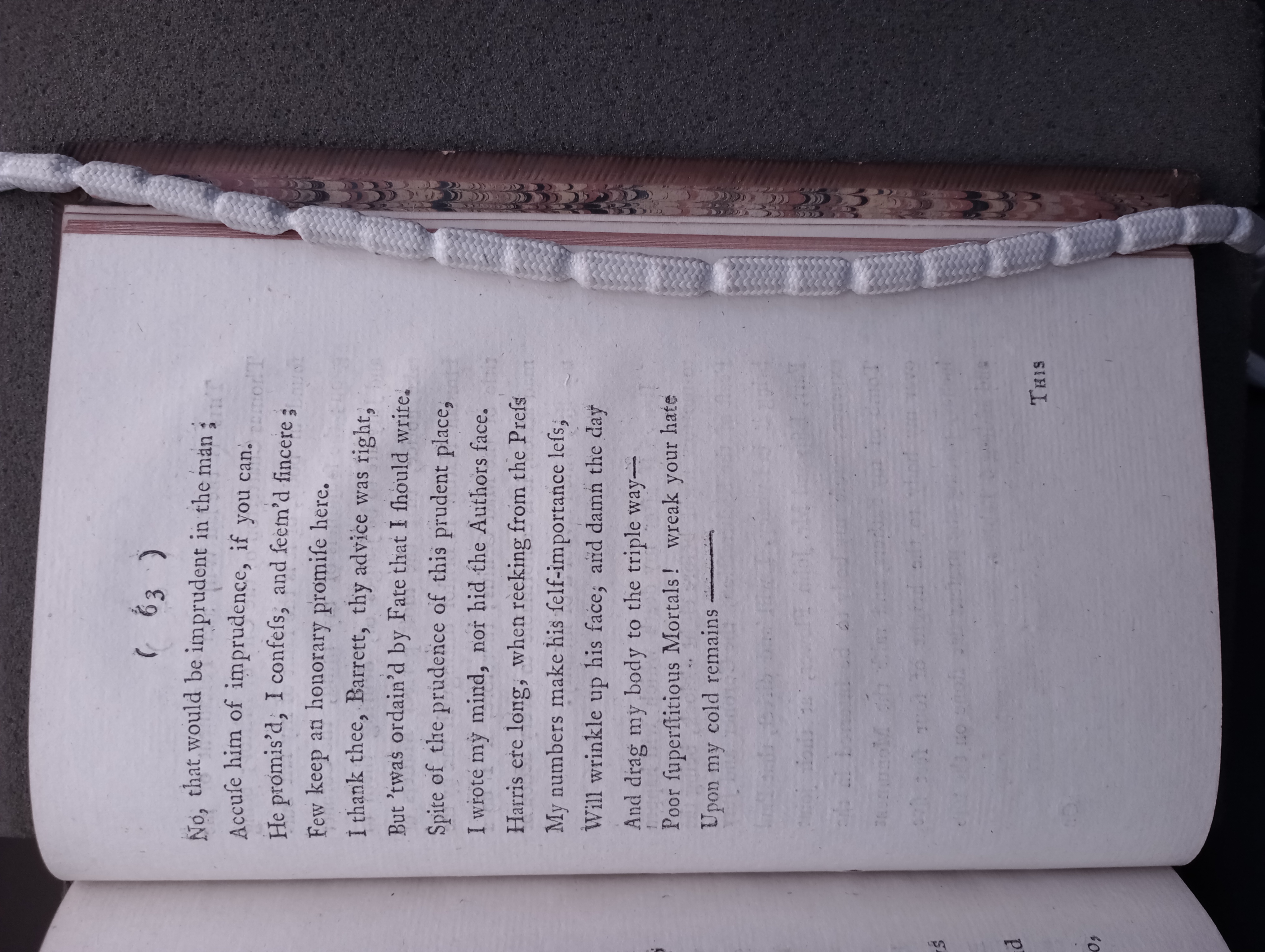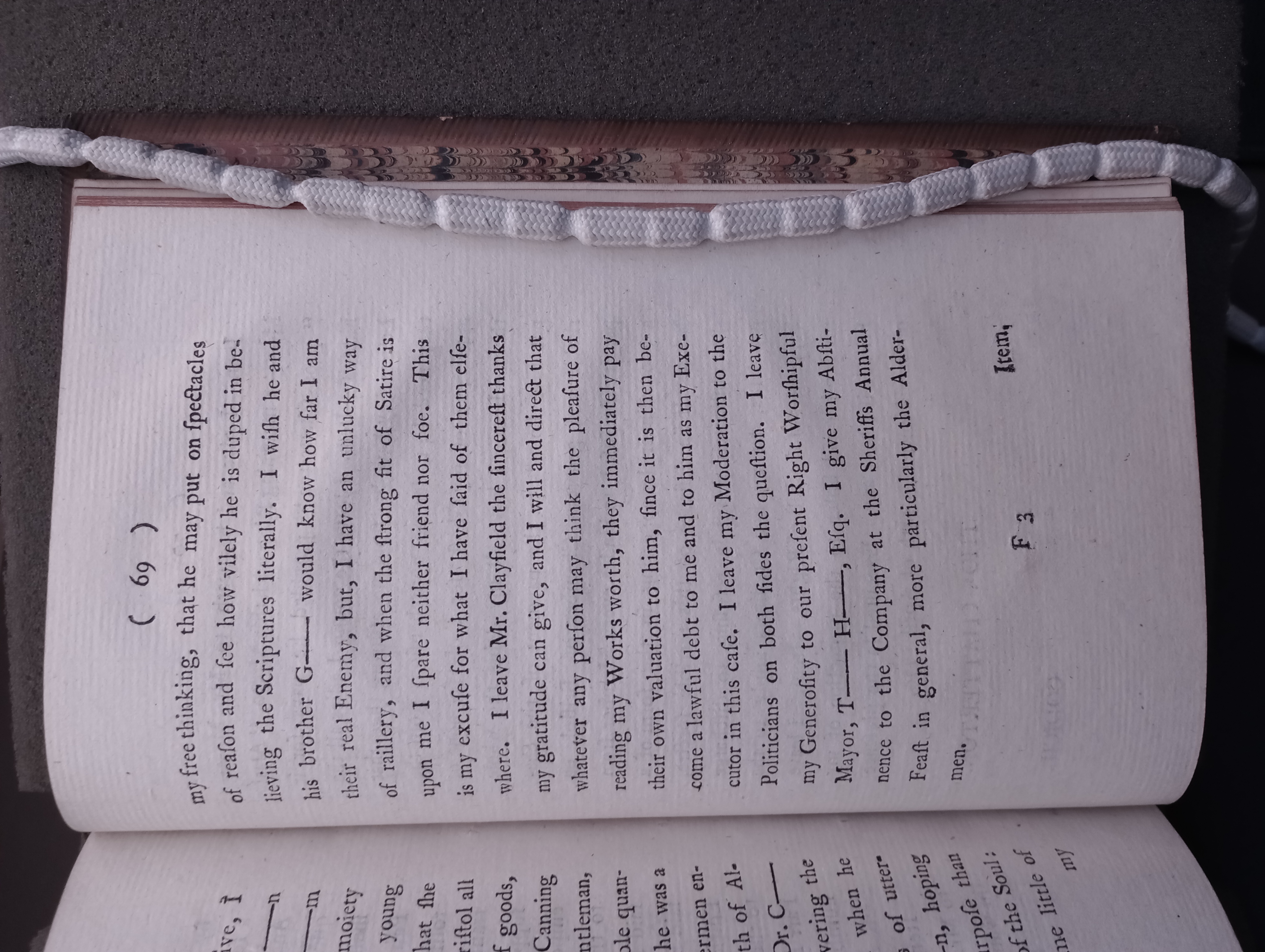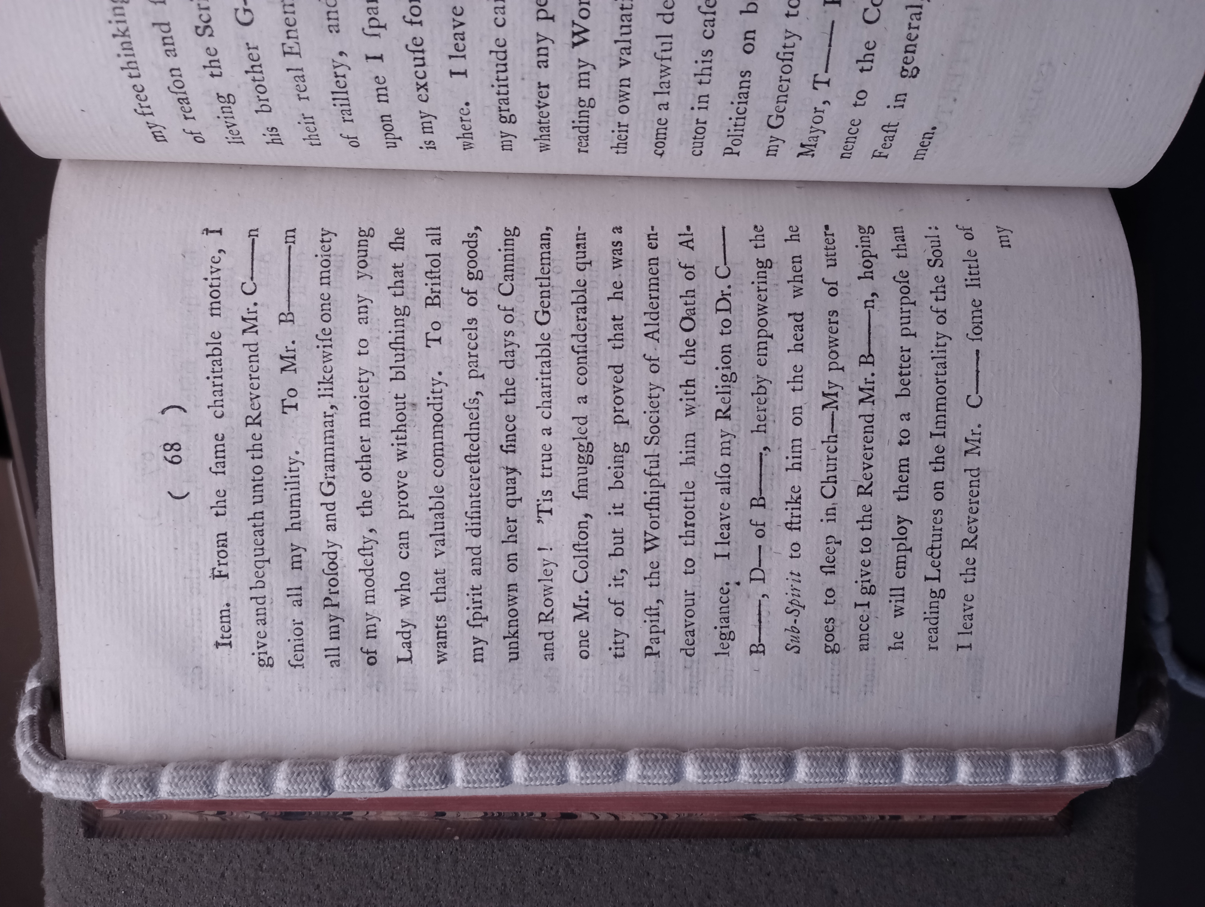 [Page 68]Item. From the same charitable motive, I give and bequeath unto the Reverend Mr. C—n senior all my humility. To Mr. B—m all my Prosody and Grammar, likewise one moiety of my modesty, the other moiety to any young Lady who can prove without blushing that she wants that valuable commodity. To Bristol all my spirit and difinterestedness, parcels of goods, unknown on her quay since the days of Canning and Rowley! 'Tis true a charitable Gentleman, one Mr. Colston, smuggled a considerable quantity of it, but it being proved that he was a Papist, the Worshipful Society of Aldermen endeavour to throttle him with the Oath of Allegiance. I leave also my Religion to Dr. C— B—, D— of B—, hereby empowering the Sub-Spirit to strike him on the head when he goes to sleep in Church — My powers of utterance I give to the Reverend Mr. B—n, hoping he will employ them to a better purpose than reading Lectures on the Immortality of the Soul: I leave the Reverend Mr. C— some little of[Page 69] my free thinking, that he may put on spectacles of reason and see how vilely he is duped in believing the Scriptures literally. I wish he and his brother G— would know how far I am their real Enemy, but, I have an unlucky way of raillery, and when the strong fit of Satire is upon me I spare neither friend nor foe. This is my excuse for what I have said of them elsewhere. I leave Mr. Clayfield the sincerest thanks my gratitude can give, and I will and direct that whatever any person may think the pleasure of reading my Works worth, they immediately pay their own valuation to him, since it is then become a lawful debt to me and to him as my Executor in this case. I leave my Moderation to the Politicians on both sides the question. I leave my Generosity to our present Right Worshipful Mayor, T— H—, Esq. I give my Abstinence to the Company at the Sheriffs Annual Feast in general, more particularly the Aldermen.
