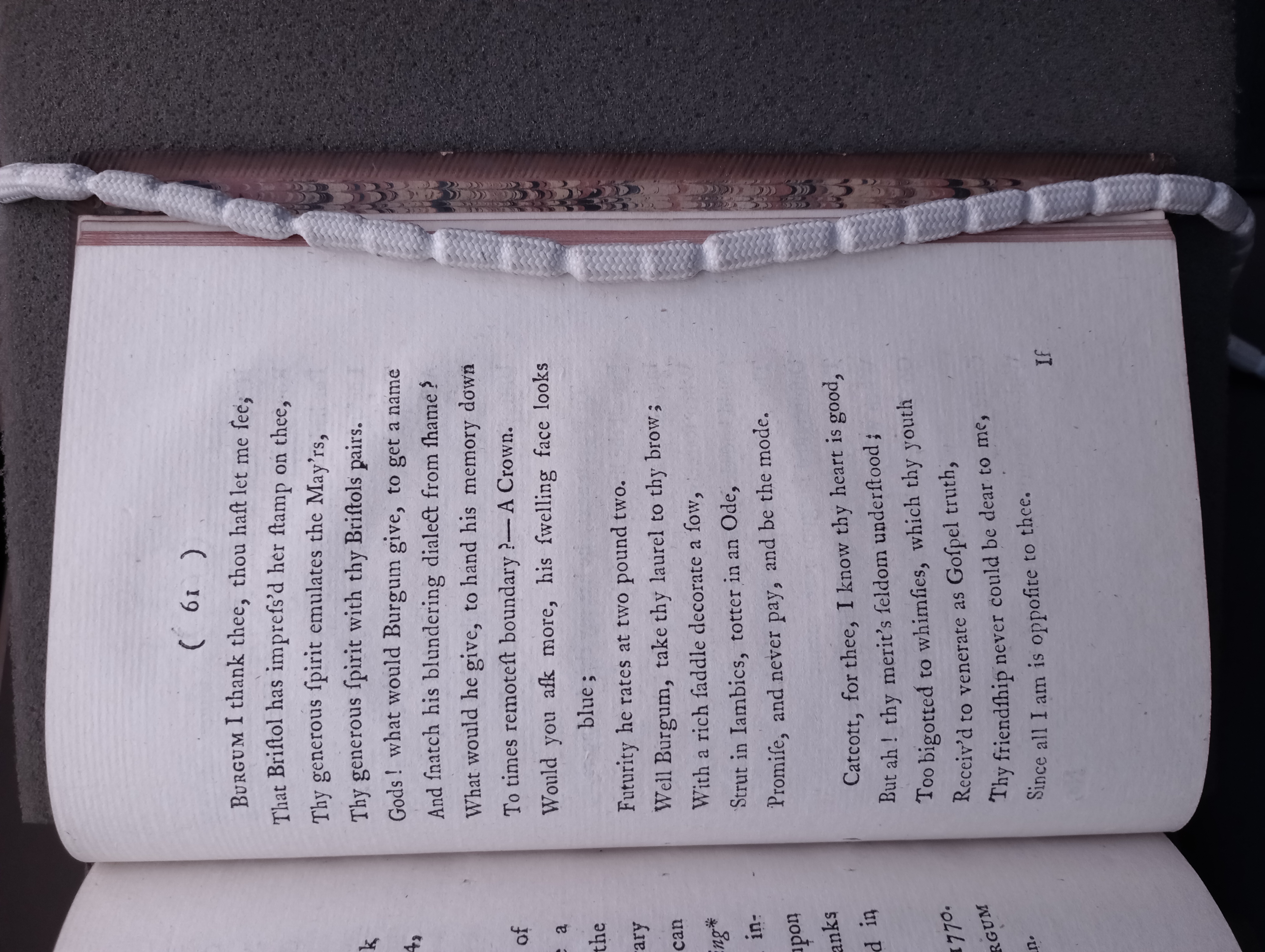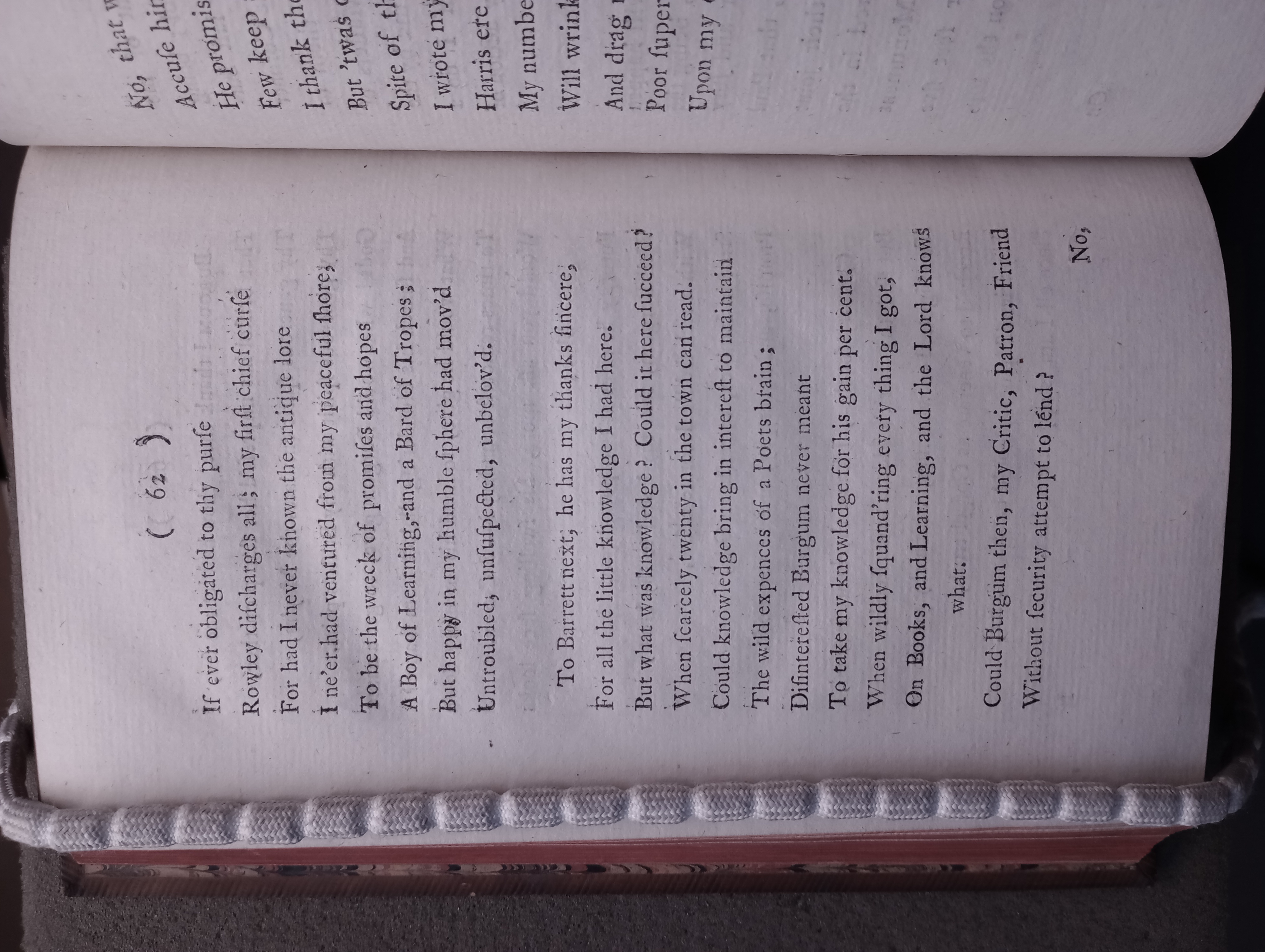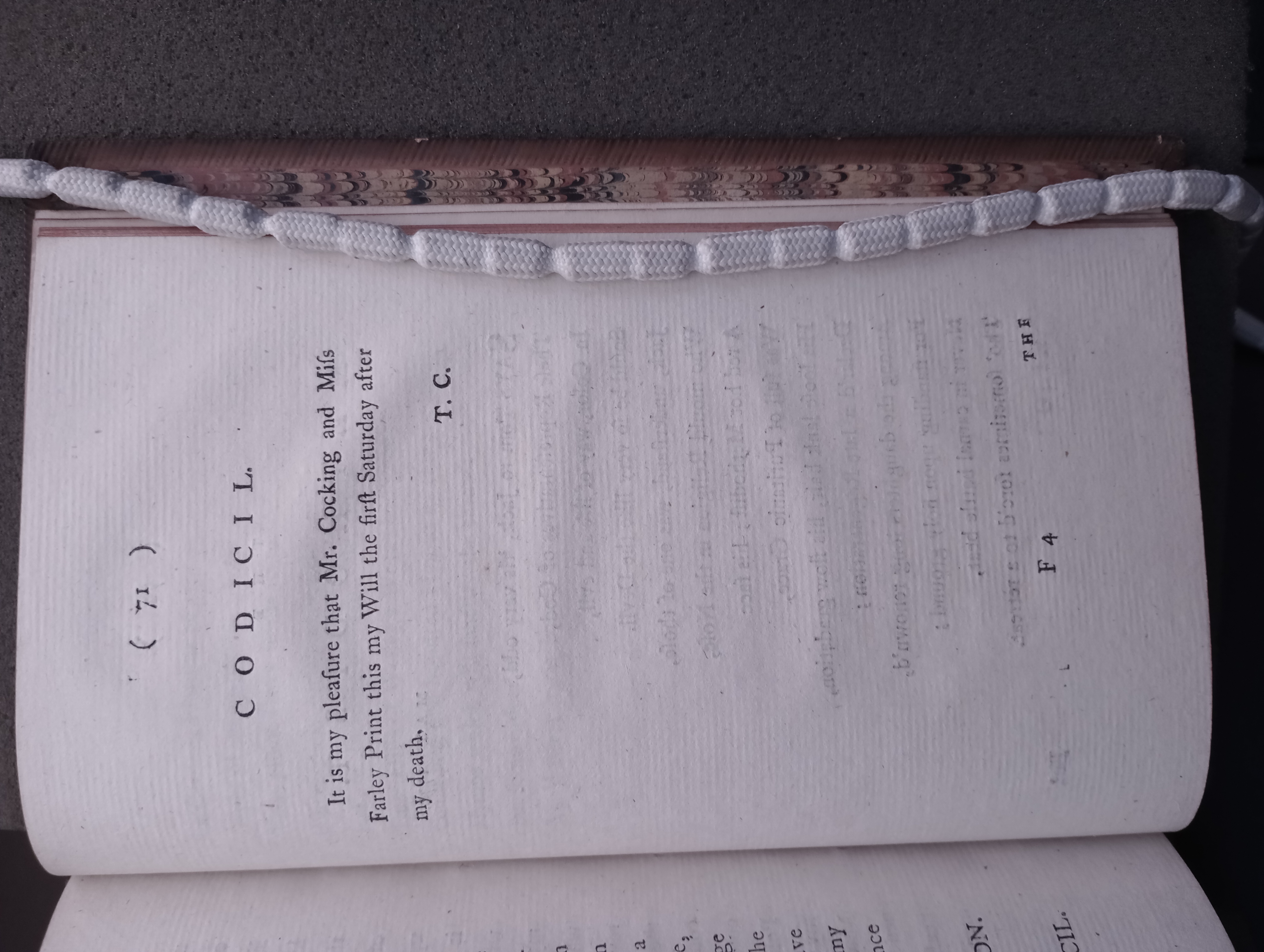 [Page 68]Item. From the same charitable motive, I give and bequeath unto the Reverend Mr. C—n senior all my humility. To Mr. B—m all my Prosody and Grammar, likewise one moiety of my modesty, the other moiety to any young Lady who can prove without blushing that she wants that valuable commodity. To Bristol all my spirit and difinterestedness, parcels of goods, unknown on her quay since the days of Canning and Rowley! 'Tis true a charitable Gentleman, one Mr. Colston, smuggled a considerable quantity of it, but it being proved that he was a Papist, the Worshipful Society of Aldermen endeavour to throttle him with the Oath of Allegiance. I leave also my Religion to Dr. C— B—, D— of B—, hereby empowering the Sub-Spirit to strike him on the head when he goes to sleep in Church — My powers of utterance I give to the Reverend Mr. B—n, hoping he will employ them to a better purpose than reading Lectures on the Immortality of the Soul: I leave the Reverend Mr. C— some little of[Page 69] my free thinking, that he may put on spectacles of reason and see how vilely he is duped in believing the Scriptures literally. I wish he and his brother G— would know how far I am their real Enemy, but, I have an unlucky way of raillery, and when the strong fit of Satire is upon me I spare neither friend nor foe. This is my excuse for what I have said of them elsewhere. I leave Mr. Clayfield the sincerest thanks my gratitude can give, and I will and direct that whatever any person may think the pleasure of reading my Works worth, they immediately pay their own valuation to him, since it is then become a lawful debt to me and to him as my Executor in this case. I leave my Moderation to the Politicians on both sides the question. I leave my Generosity to our present Right Worshipful Mayor, T— H—, Esq. I give my Abstinence to the Company at the Sheriffs Annual Feast in general, more particularly the Aldermen.