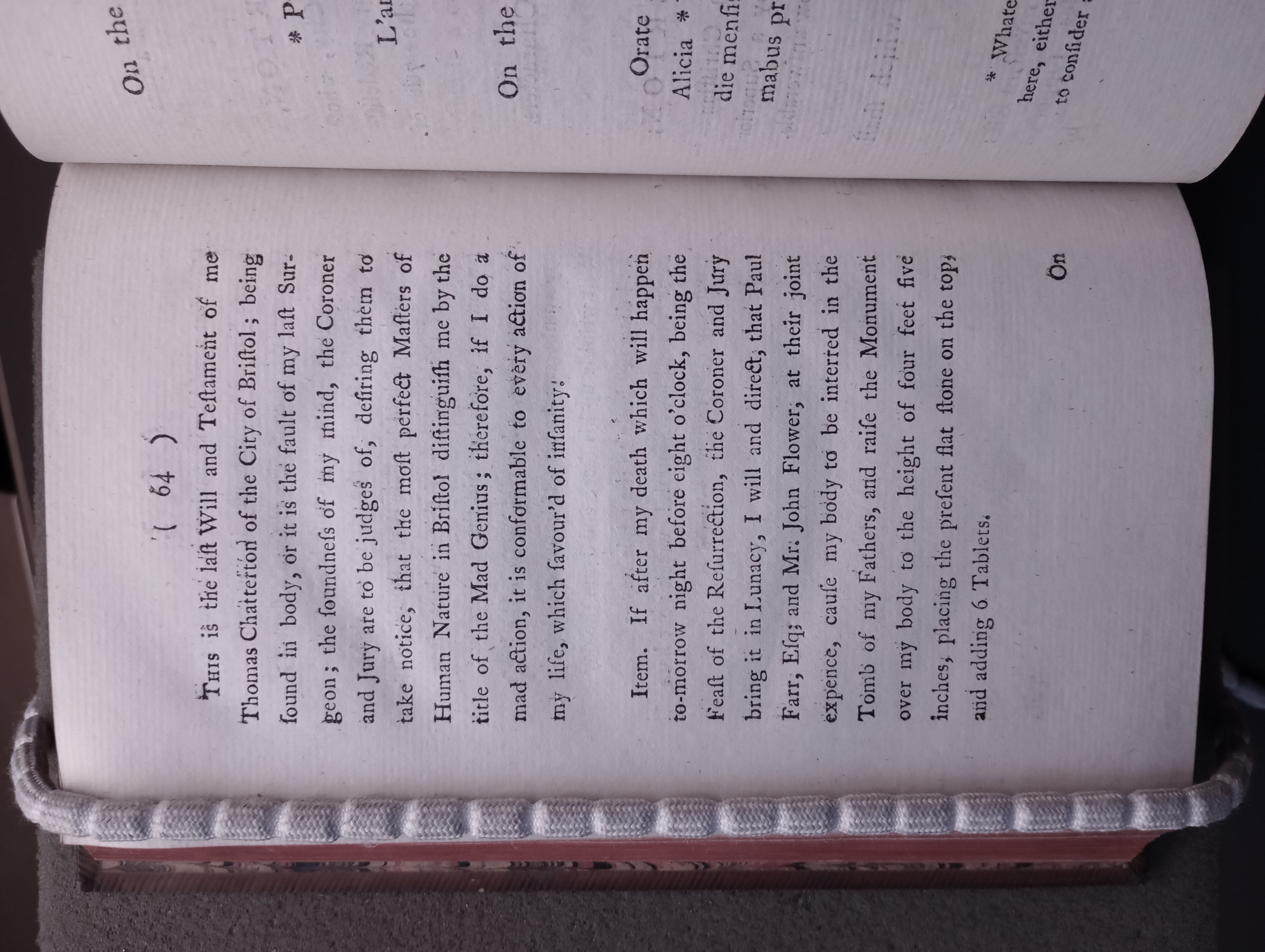 [Page 61]THIS is the last Will and Testament of me Thomas Chatterton of the City of Bristol; being sound in body, or it is the fault of my last Surgeon; the soundness of my mind, the Coroner and Jury are to be judges of, desiring them to take notice, that the most perfect Masters of Human Nature in Bristol distinguish me by the title of the Mad Genius; therefore, if I do a mad action, it is conformable to every action of my life, which savour'd of insanity.
