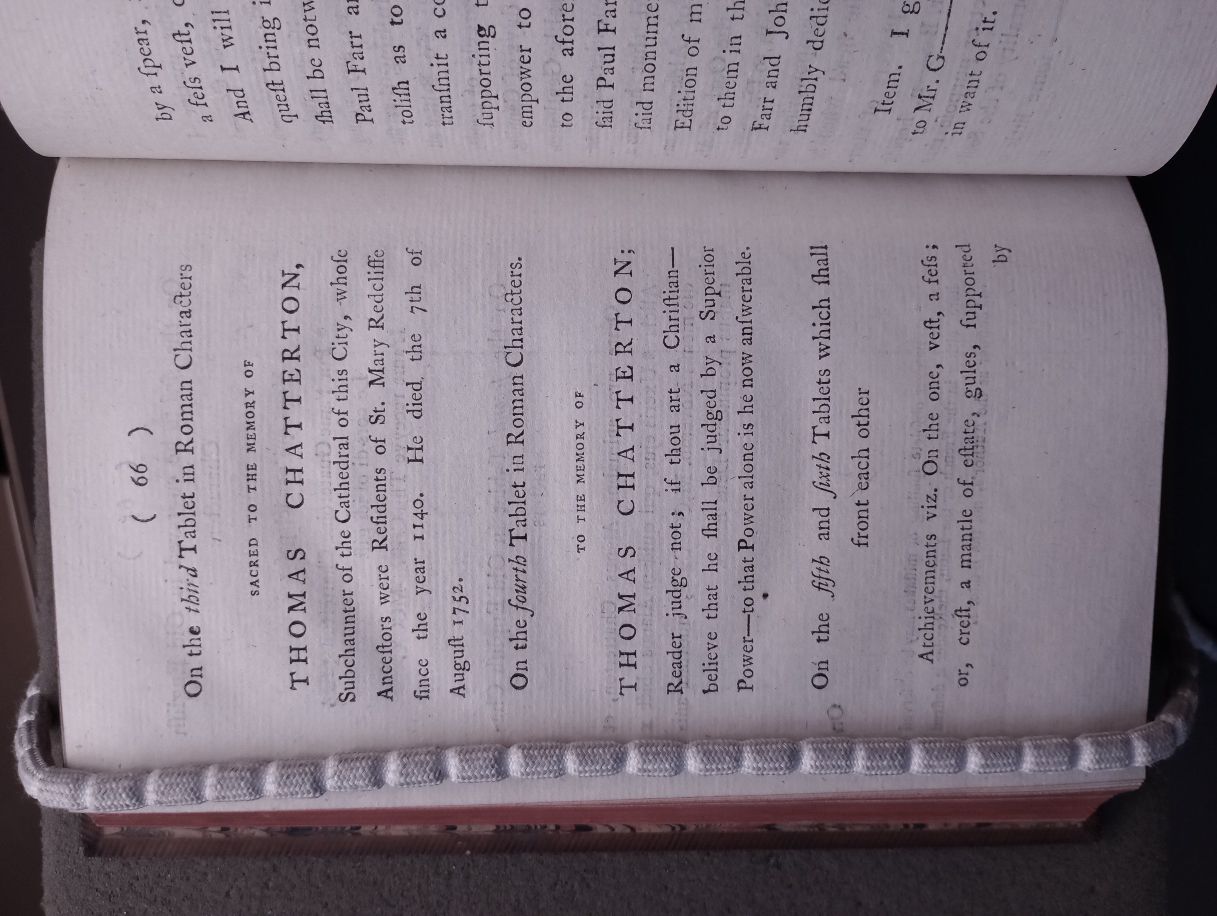 Chatterton, Thomas, 1752-1770. A Supplement to the Miscellanies of Thomas Chatterton London: printed for T. Becket, in Pall-Mall; Bookseller to His Royal Highness the Prince of Wales, and Their Royal Highnesses the Princes. MDCCLXXXIV., 1784, pp. 60-71. [6],ii,88p.; 8⁰. (ESTC T48948; OTA K045459.000) (Page images digitized from a copy in the Bodleian Library [Harding C 696 (1)].)