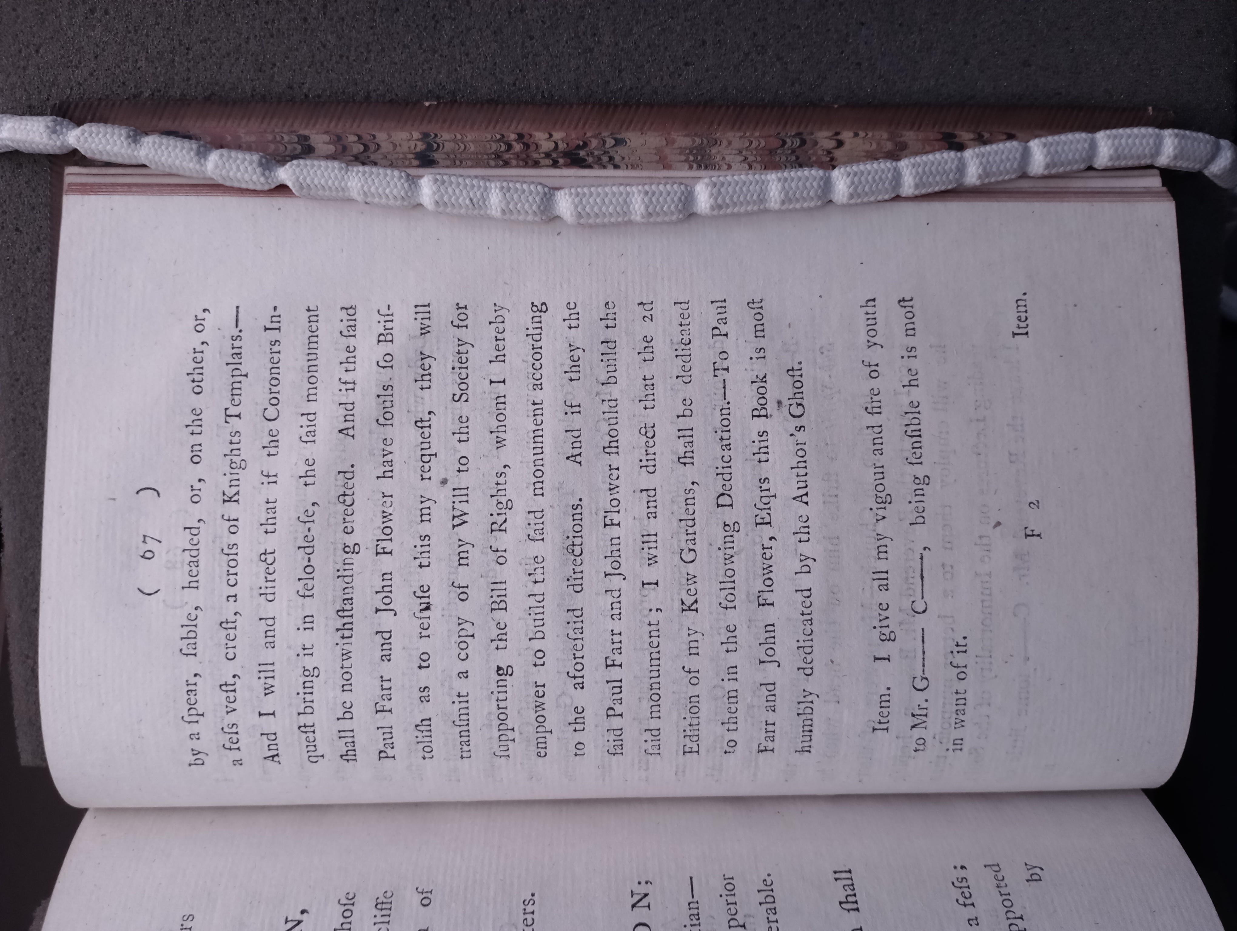 Atchievements viz. On the one, vest, a fess; or, crest, a mantle of estate, gules, supported[Page 67] by a spear, sable, headed, or, on the other, or, a fess vest, crest, a cross of Knights Templars. — And I will and direct that if the Coroners Inquest bring it in felo-de-se, the said monument shall be notwithstanding erected. And if the said Paul Farr and John Flower have souls so Bristolish as to refuse this my request, they will transmit a copy of my Will to the Society for supporting the Bill of Rights, whom I hereby empower to build the said monument according to the aforesaid directions. And if they the said Paul Farr and John Flower should build the said monument; I will and direct that the 2d Edition of my Kew Gardens, shall be dedicated to them in the following Dedication. — To Paul Farr and John Flower, Esqrs this Book is most humbly dedicated by the Author's Ghost.