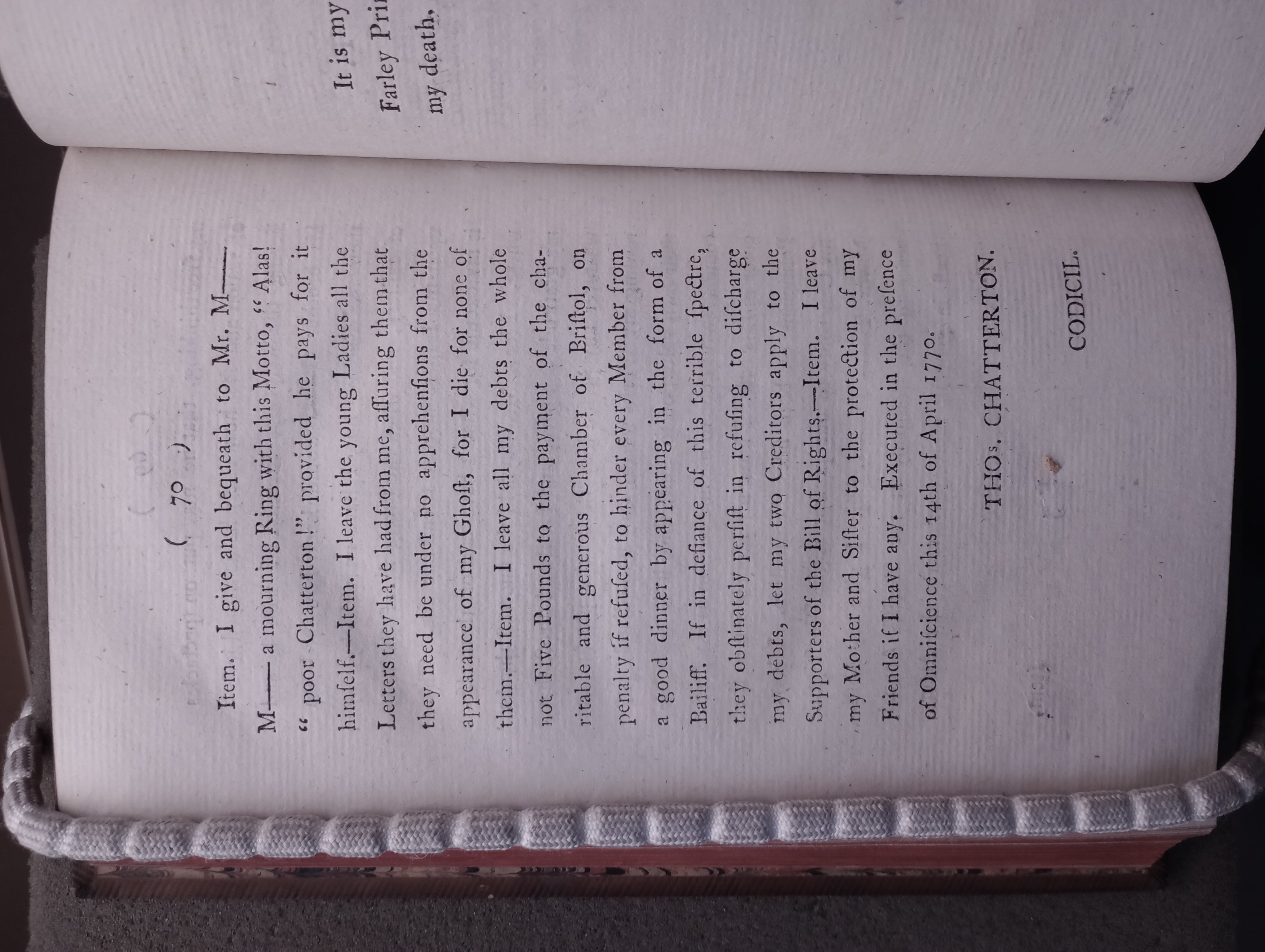 [Page 70]Item. I give and bequeath to Mr. M— M— a mourning Ring with this Motto, "Alas! poor Chatterton!"provided he pays for it himself. — Item. I leave the young Ladies all the Letters they have had from me, assuring them that they need be under no apprehensions from the appearance of my Ghost, for I die for none of them. — Item. I leave all my debts the whole not Five Pounds to the payment of the charitable and generous Chamber of Bristol, on penalty if refused, to hinder every Member from a good dinner by appearing in the form of a Bailiff. If in defiance of this terrible spectre, they obstinately persist in refusing to discharge my debts, let my two Creditors apply to the Supporters of the Bill of Rights. — Item. I leave my Mother and Sister to the protection of my Friends if I have any. Executed in the presence of Omniscience this 14th of April 1770.