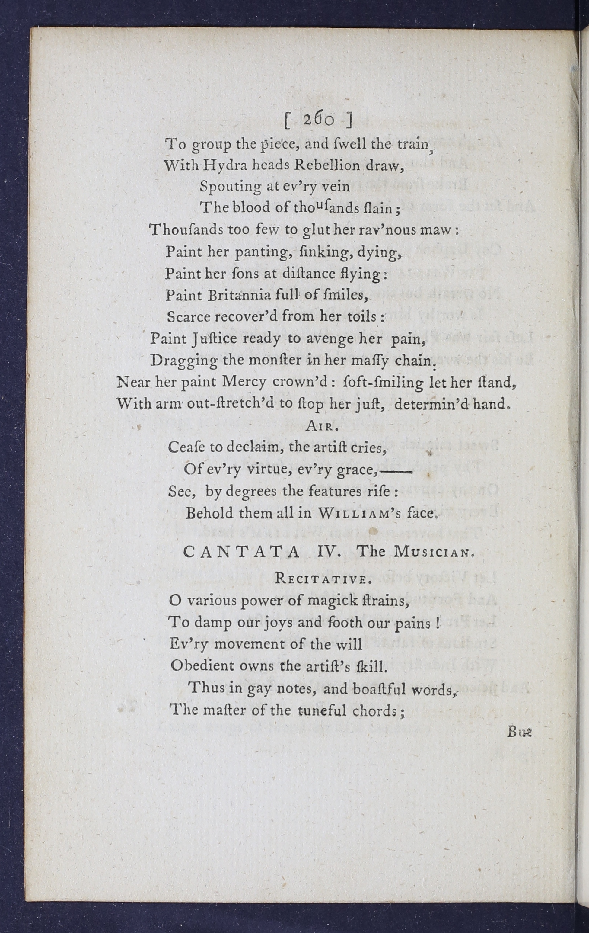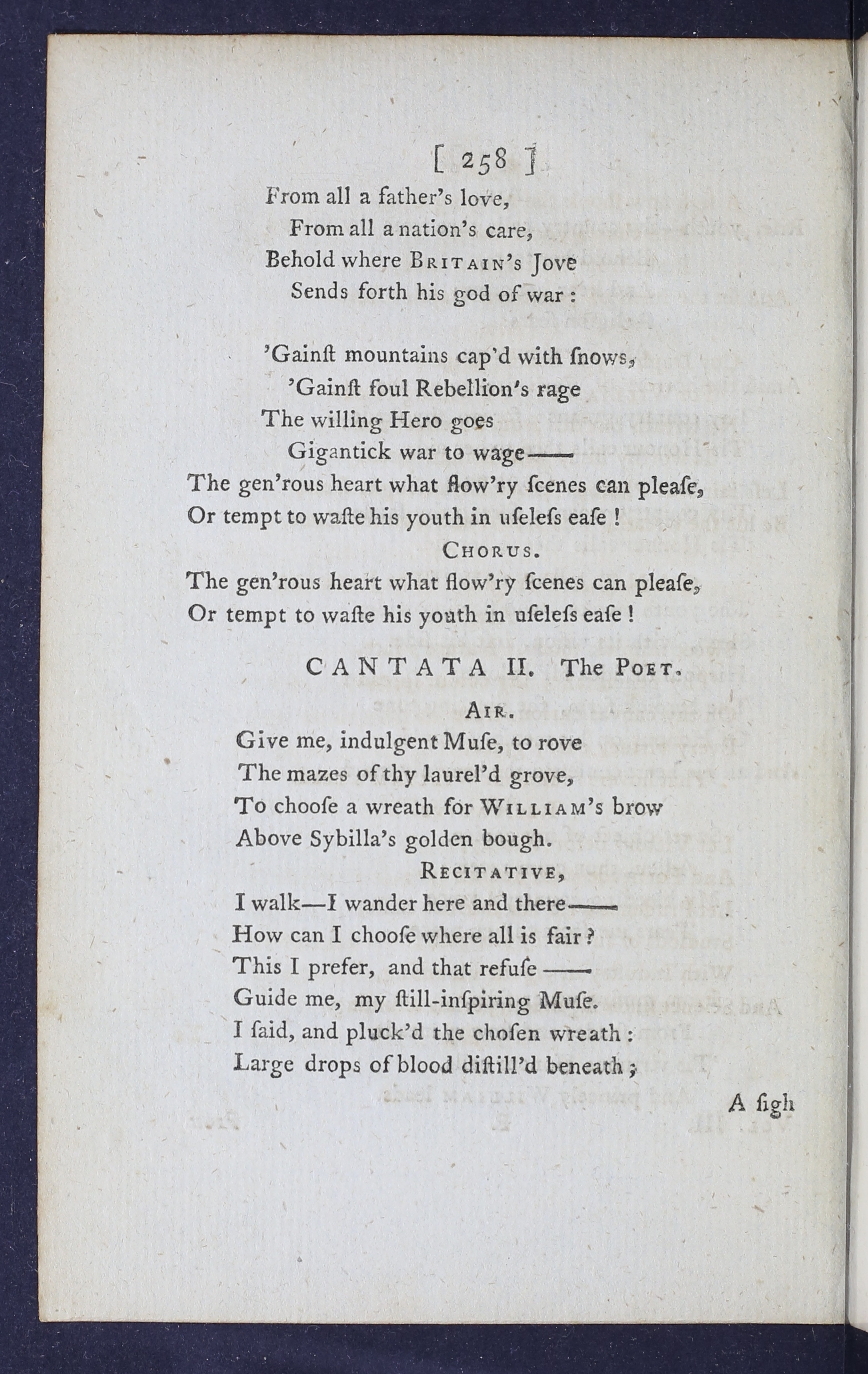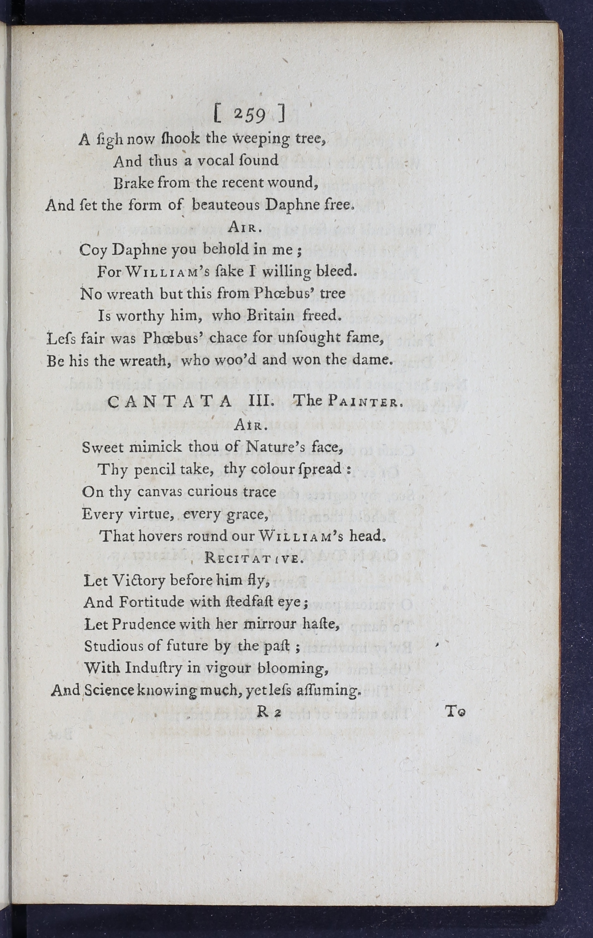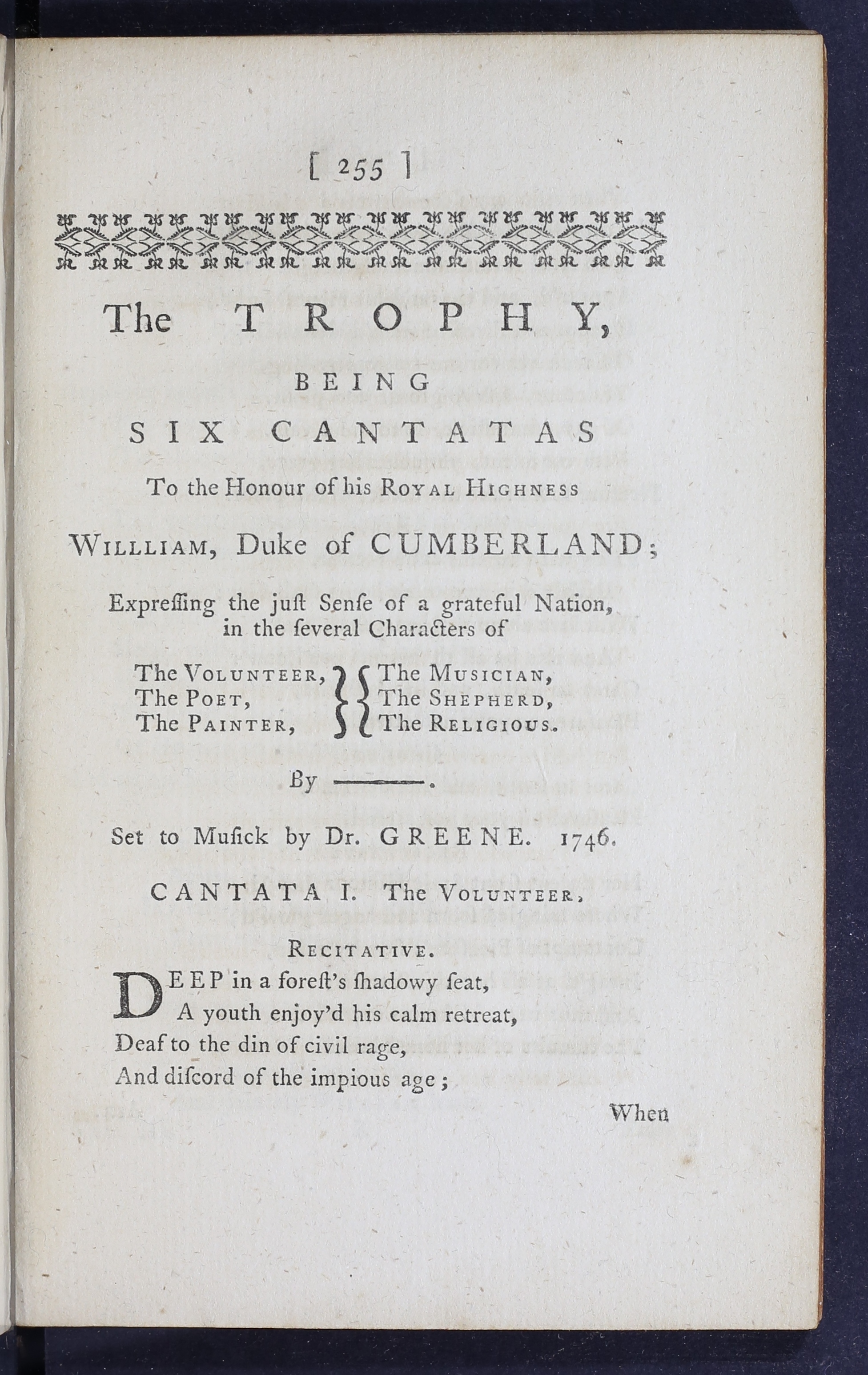Title (in Source Edition): The TROPHY, BEING SIX CANTATAS To the Honour of his ROYAL HIGHNESS WILLLIAM, Duke of CUMBERLAND; Expressing the just Sense of a grateful Nation, in the several Characters of The VOLUNTEER, The POET, The PAINTER, The MUSICIAN, The SHEPHERD, The RELIGIOUS.