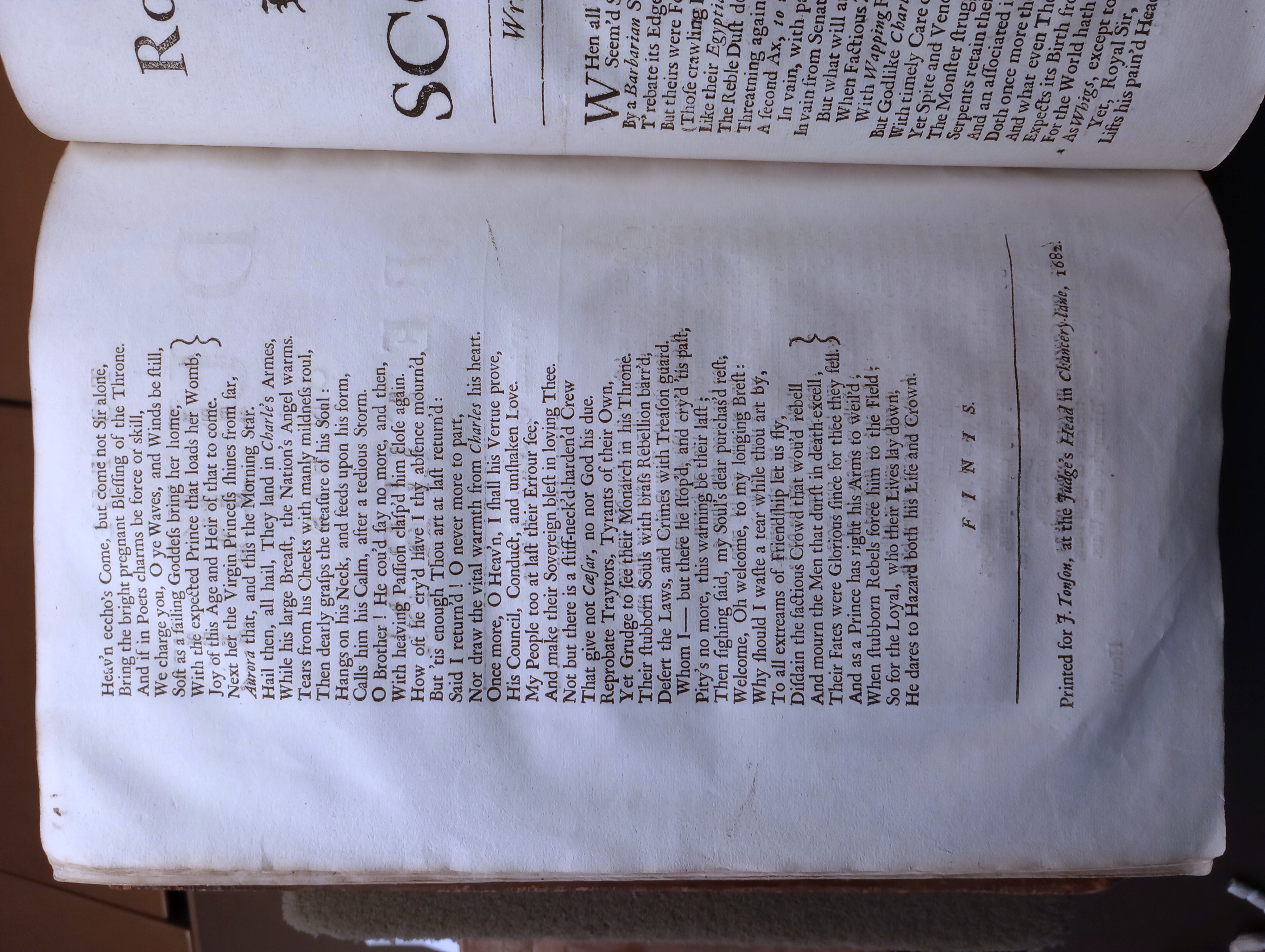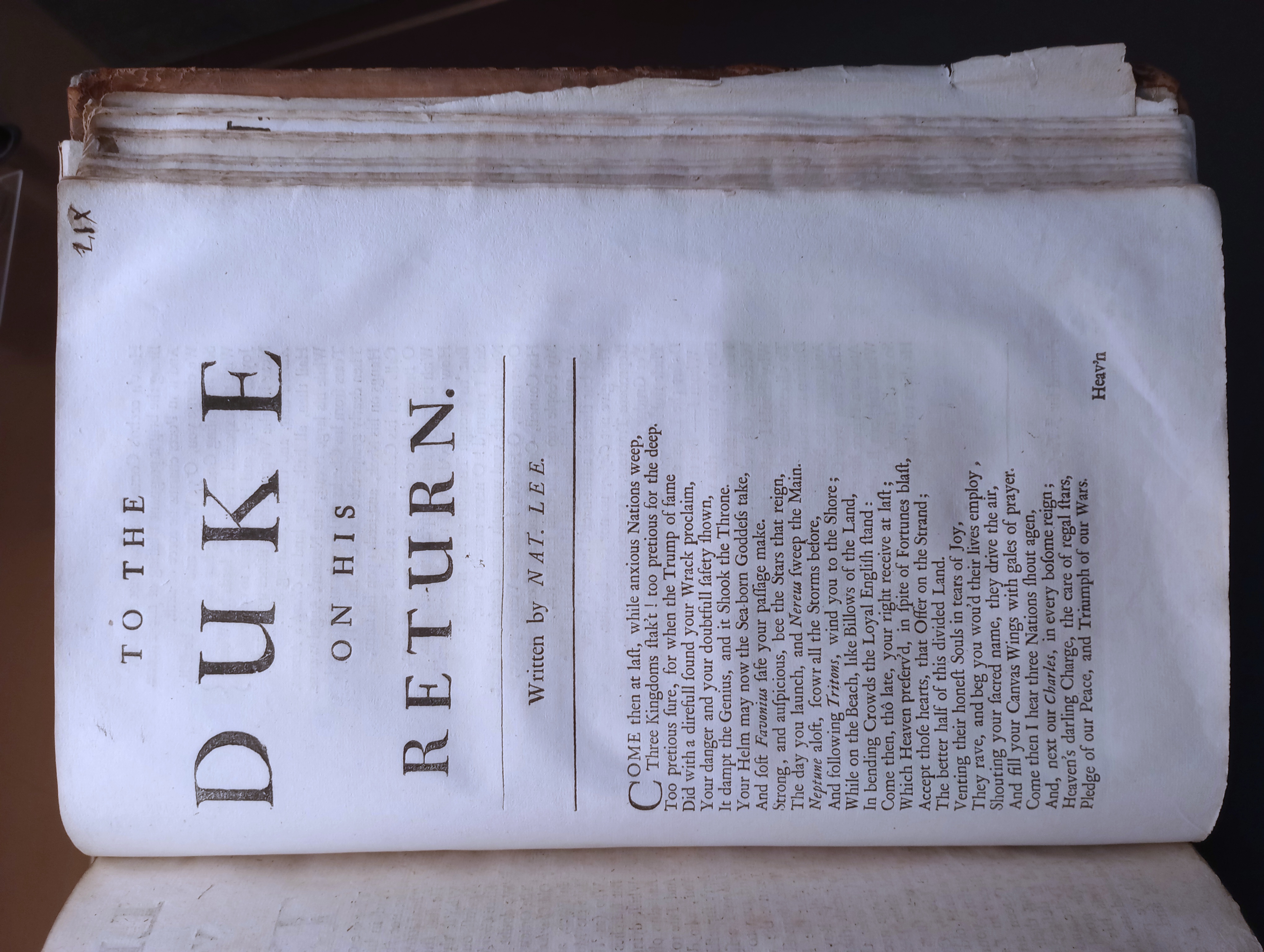 Lee, Nathaniel, 1650?-1692. To the Duke on his return written by Nat. Lee. [London]: Printed for J. Tonson ..., 1682. 1 sheet ([2]p.) (Page images digitized from a copy in the Bodleian Library [Ashm. 1094 (59)].)