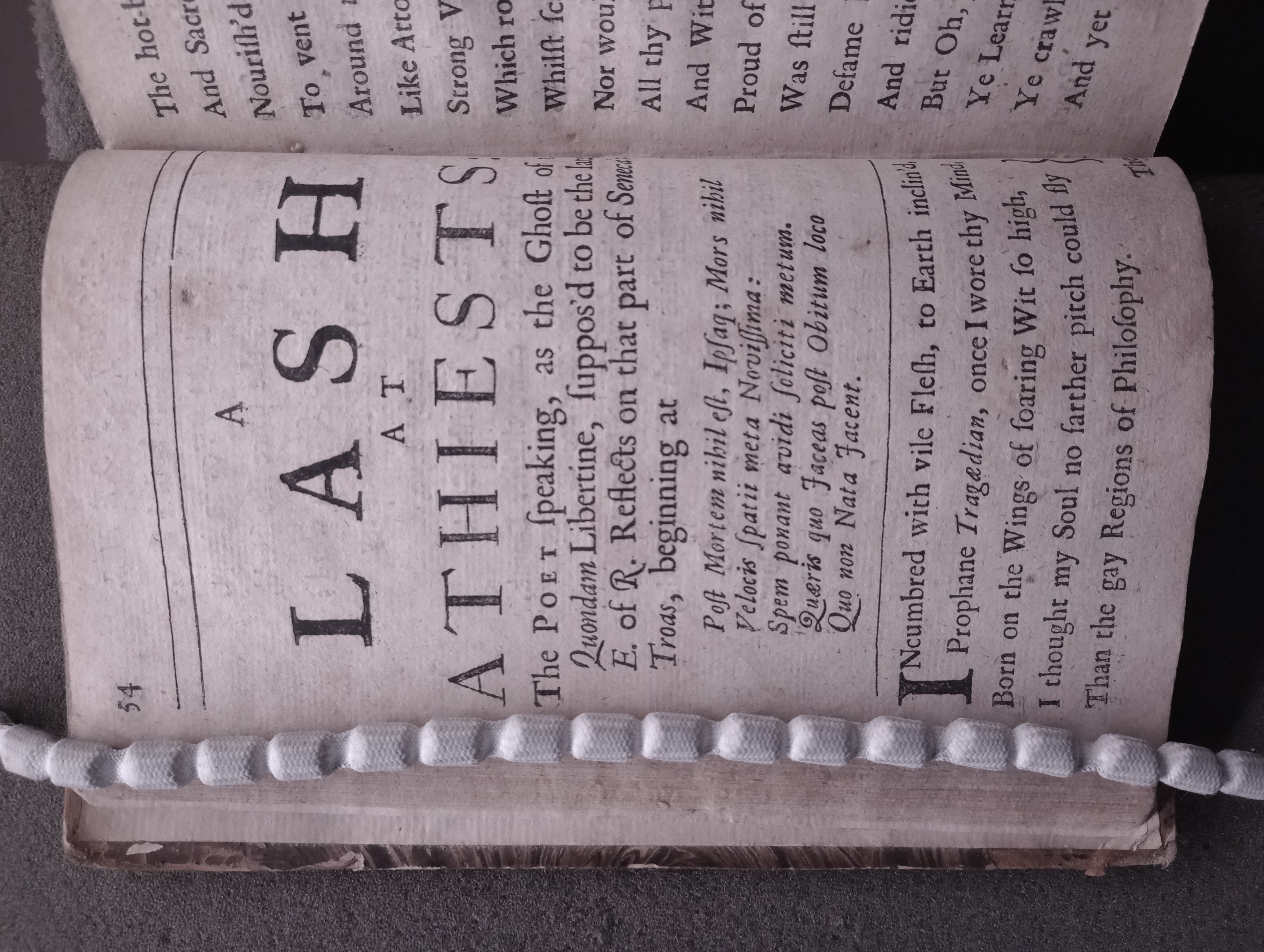 Title (in Source Edition): A LASH AT ATHEISTS: The POET speaking, as the Ghost of a Quondam Libertine, suppos'd to be the late E. of R. Reflects on that part of Seneca's Troas, beginning atPost Mortem nihil est, Ipsaq; Mors nihilVelocis spatii meta Novissima:Spem ponant avidi seliciti metum.Quaeris quo Iaceas post Obitum locoQuo non Nata Iacent.