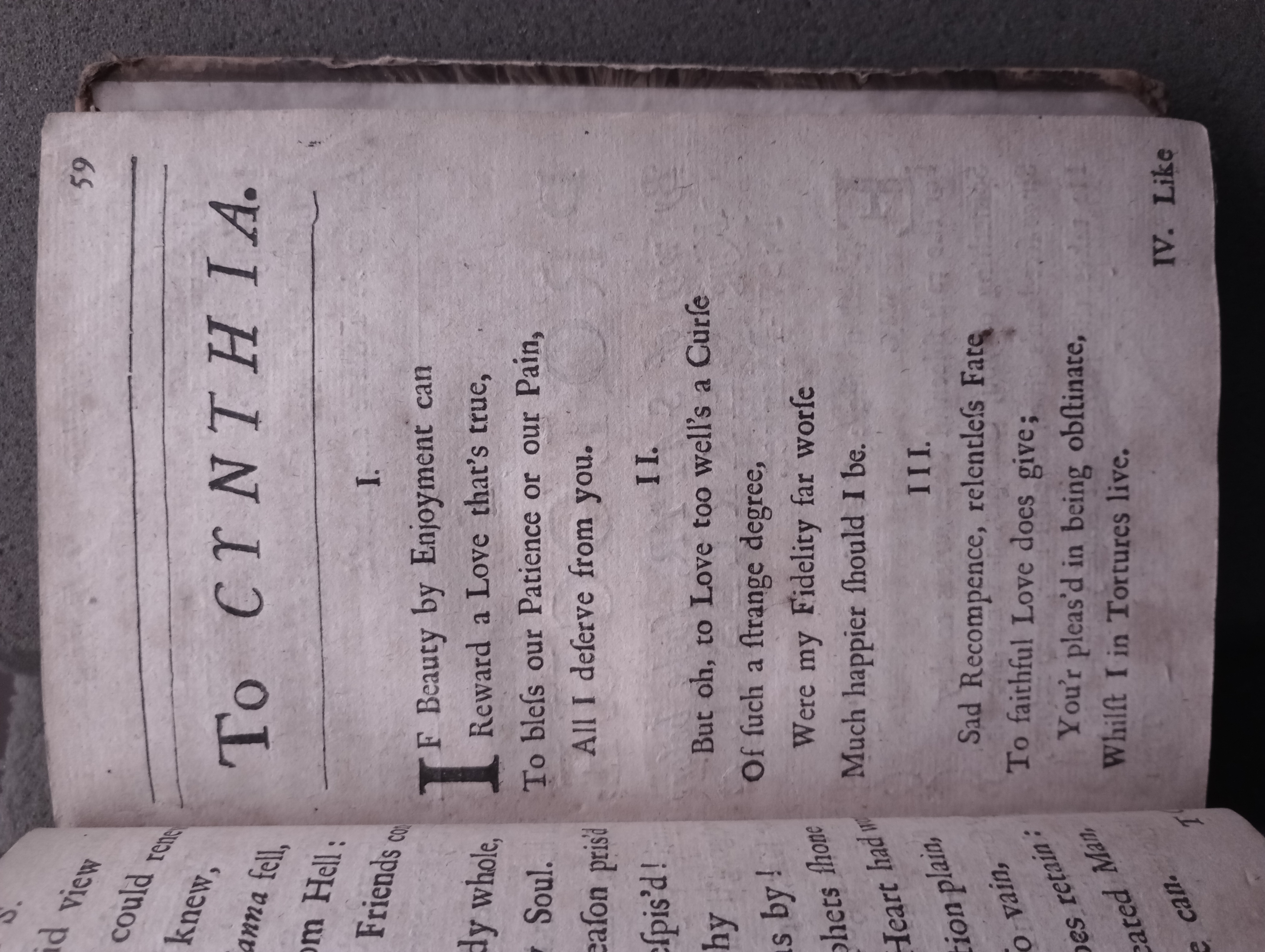 D'Urfey, Thomas, 1653-1723. New poems, consisting of satyrs, elegies, and odes together with a choice collection of the newest court songs set to musick by the best masters of the age / all written by Mr. D'Urfey. London: Printed for J. Bullord ... and A. Roper ..., 1690, pp. 59-60. [16],207,[1]p. (ESTC R17889) (Page images digitized from a copy in the Bodleian Library [Harding C 1197 (1)].)