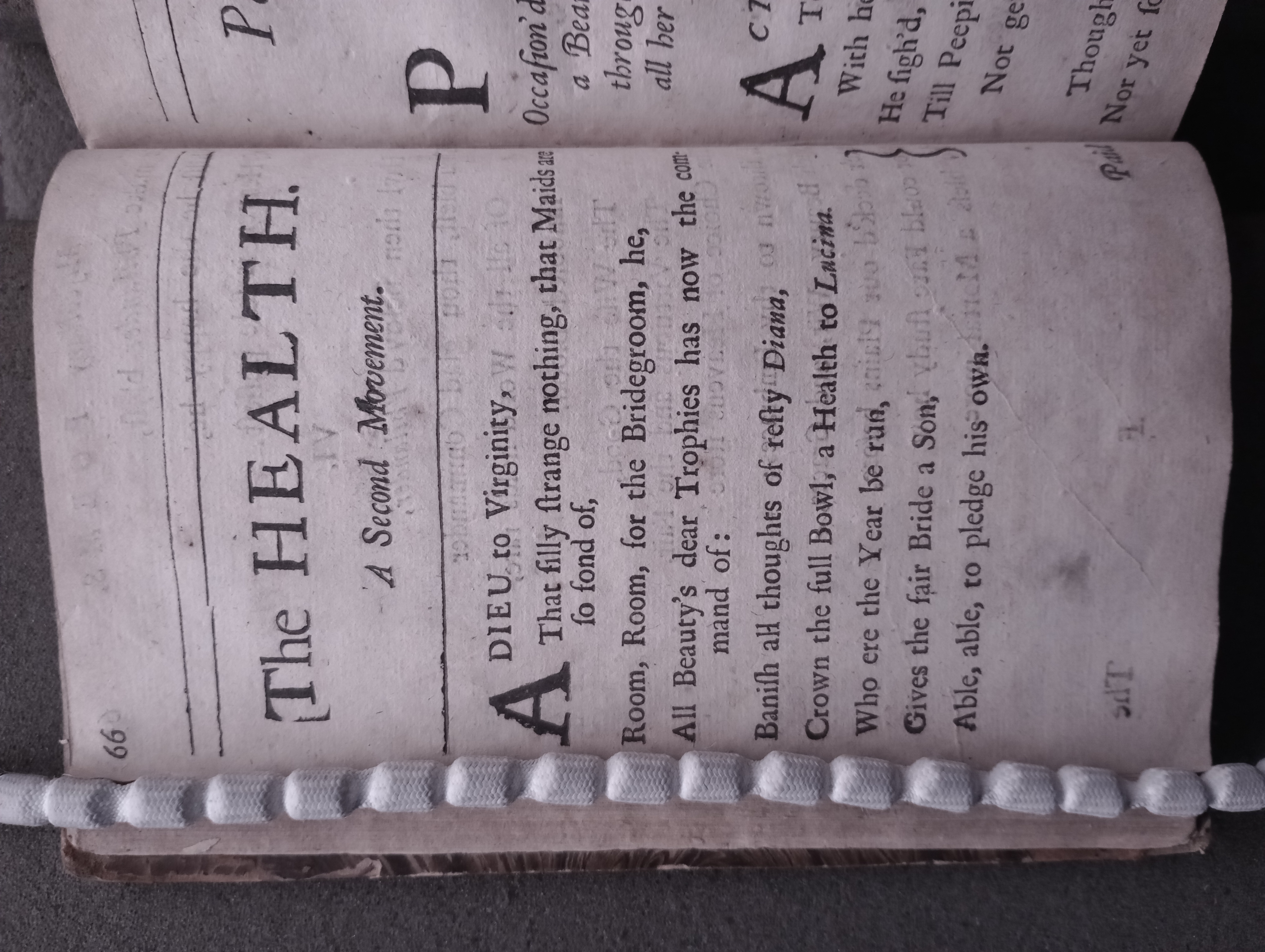 D'Urfey, Thomas, 1653-1723. New poems, consisting of satyrs, elegies, and odes together with a choice collection of the newest court songs set to musick by the best masters of the age / all written by Mr. D'Urfey. London: Printed for J. Bullord ... and A. Roper ..., 1690, p. 66. [16],207,[1]p. (ESTC R17889) (Page images digitized from a copy in the Bodleian Library [Harding C 1197 (1)].)