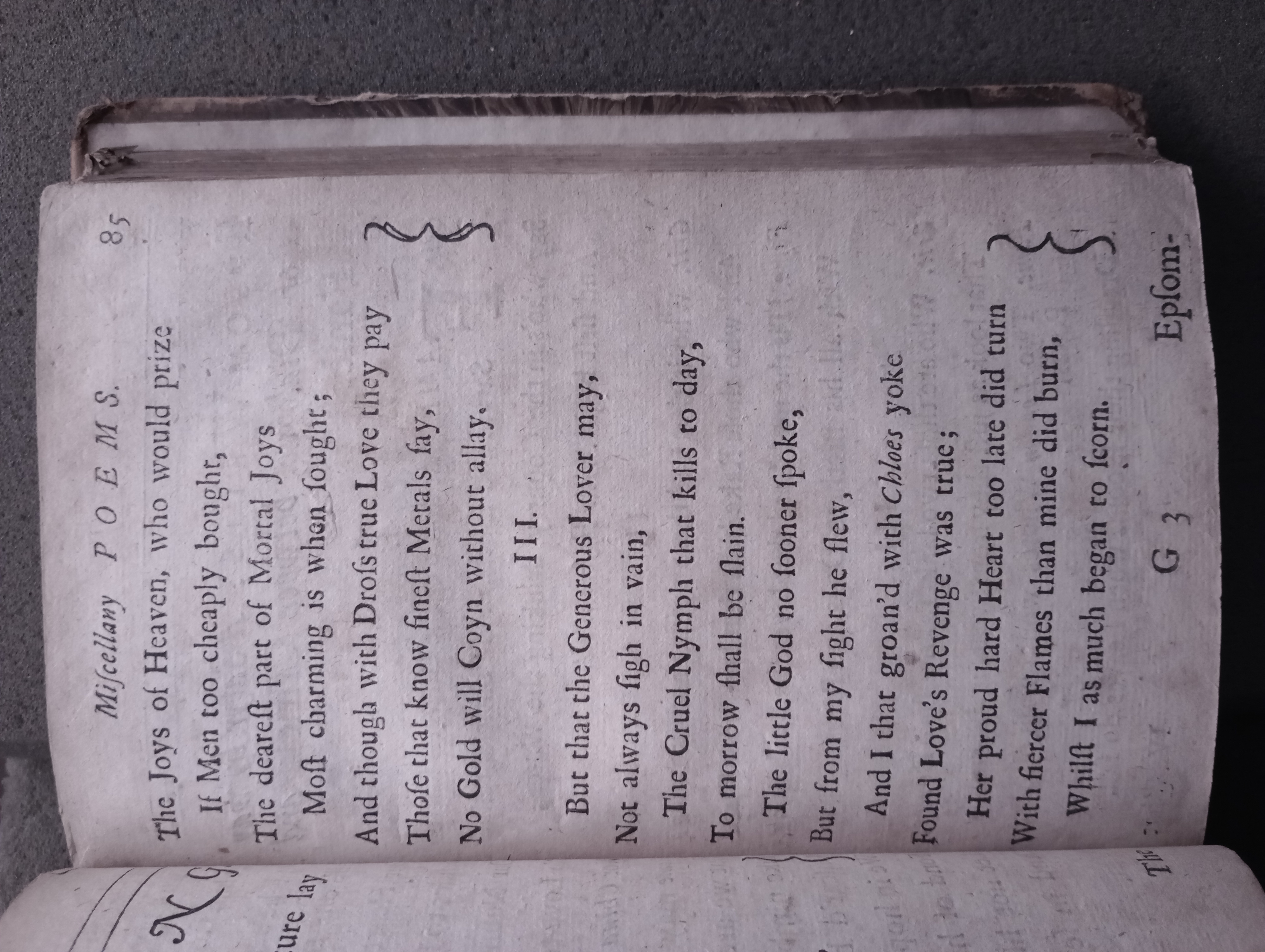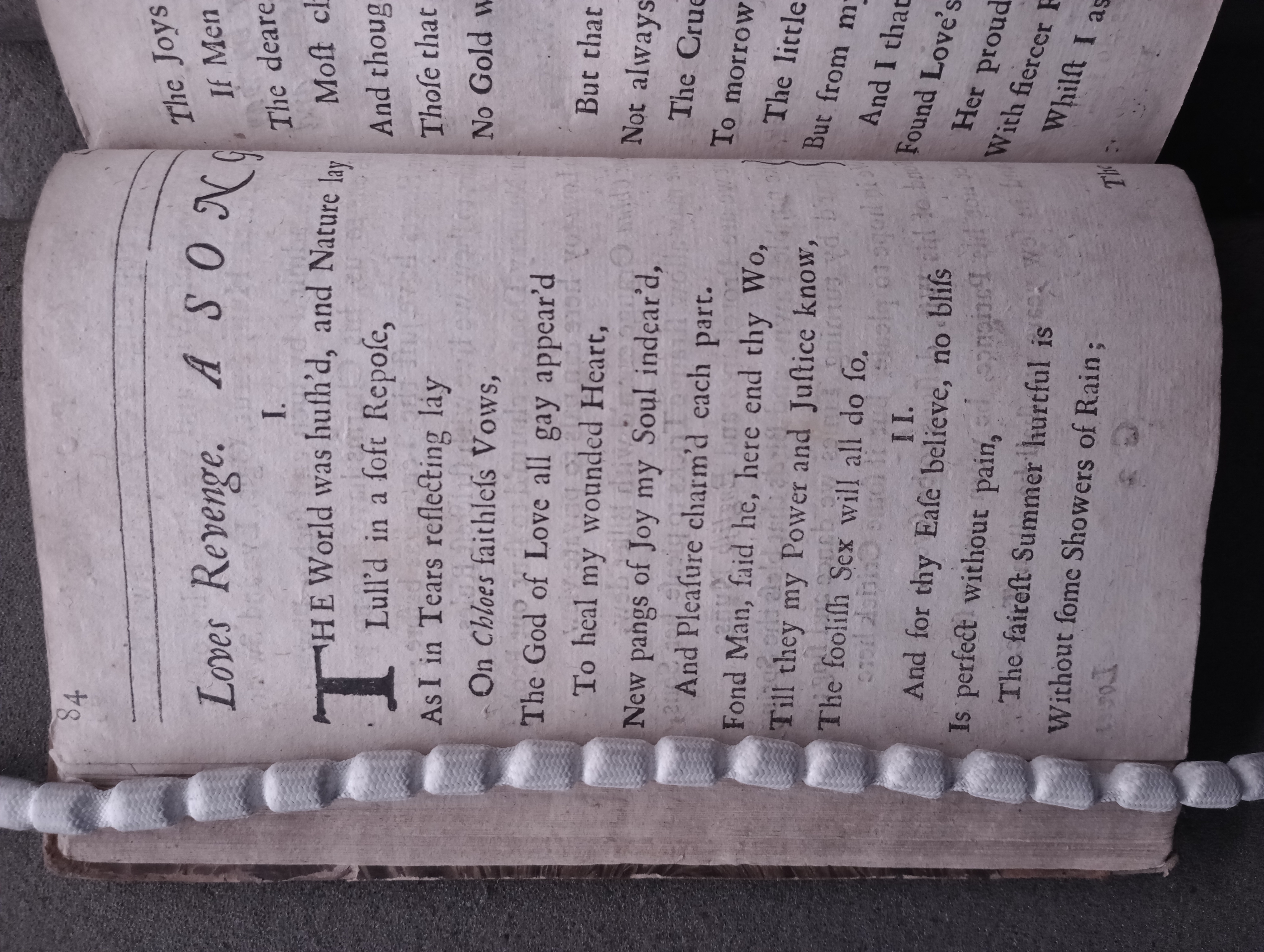 D'Urfey, Thomas, 1653-1723. New poems, consisting of satyrs, elegies, and odes together with a choice collection of the newest court songs set to musick by the best masters of the age / all written by Mr. D'Urfey. London: Printed for J. Bullord ... and A. Roper ..., 1690, pp. 84-85. [16],207,[1]p. (ESTC R17889) (Page images digitized from a copy in the Bodleian Library [Harding C 1197 (1)].)