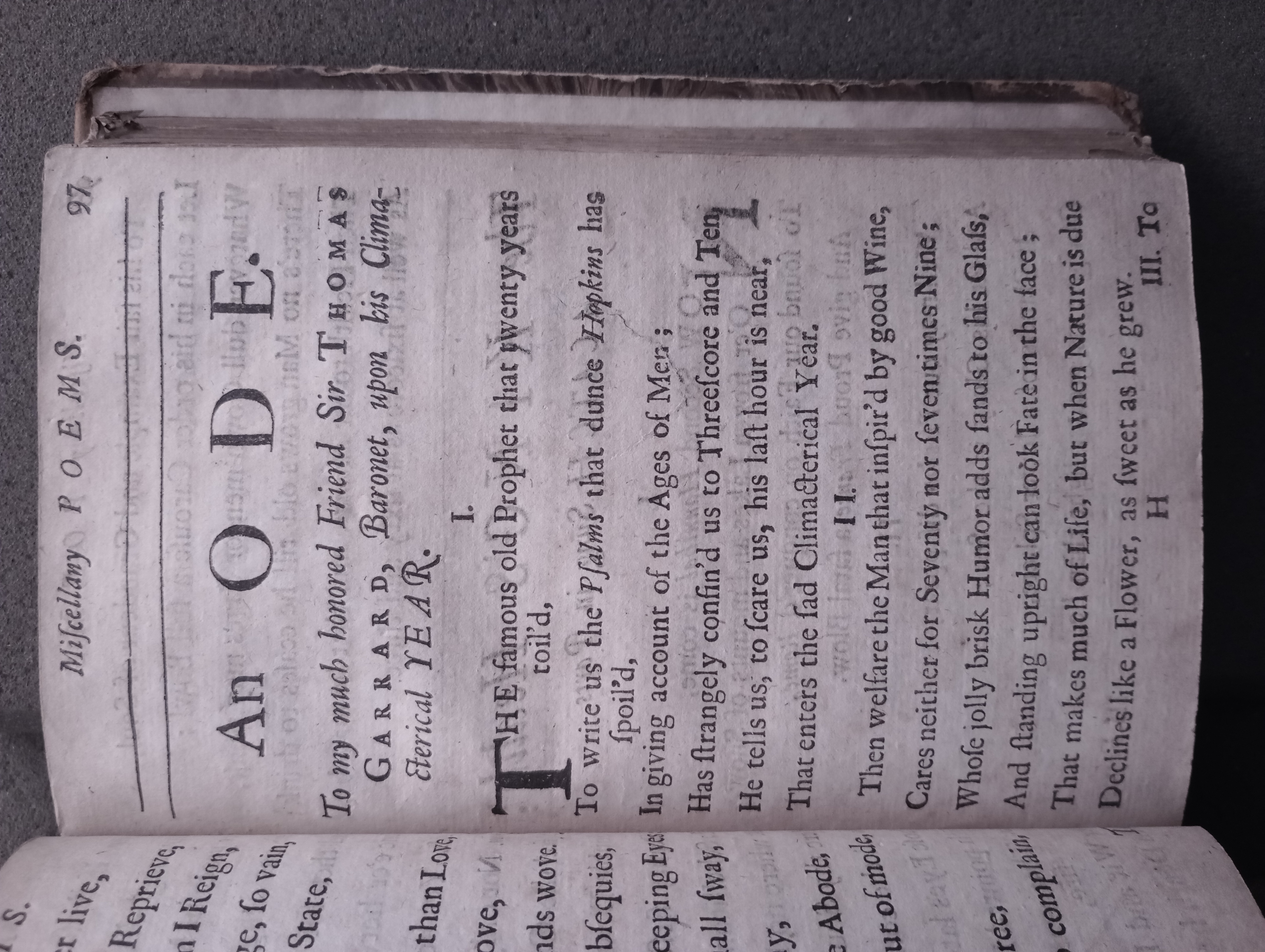 Title (in Source Edition): An ODE. To my much honored Friend Sir THOMAS GARRARD, Baronet, upon his Climacterical YEAR.