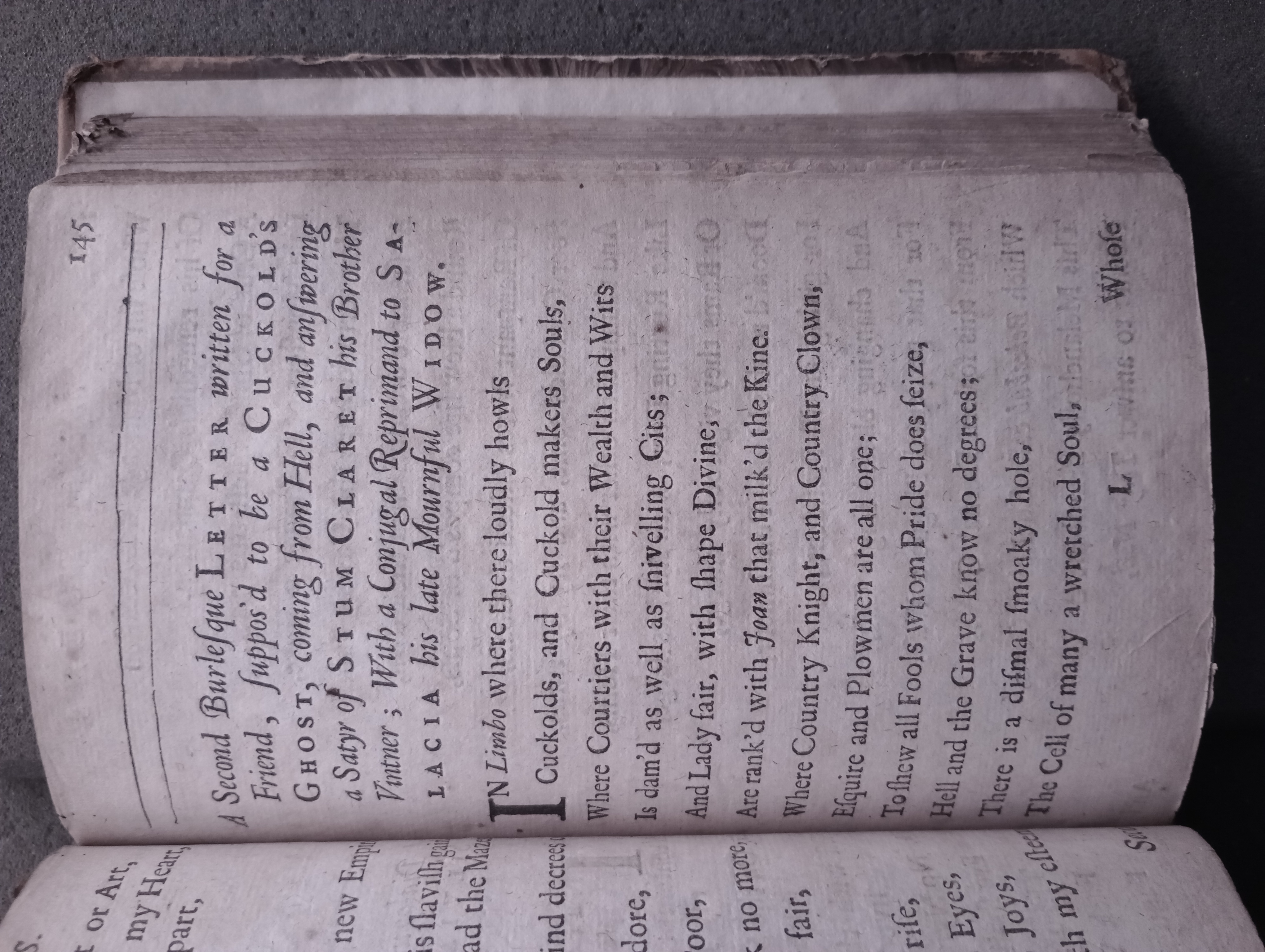 Title (in Source Edition): A Second Burlesque LETTER written for a Friend, suppos'd to be a CUCKOLD'S GHOST, coming from Hell, and answering a Satyr of STUM CLARET his Brother Vintner; With a Conjugal Reprimand to SALACIA his late Mournful WIDOW.