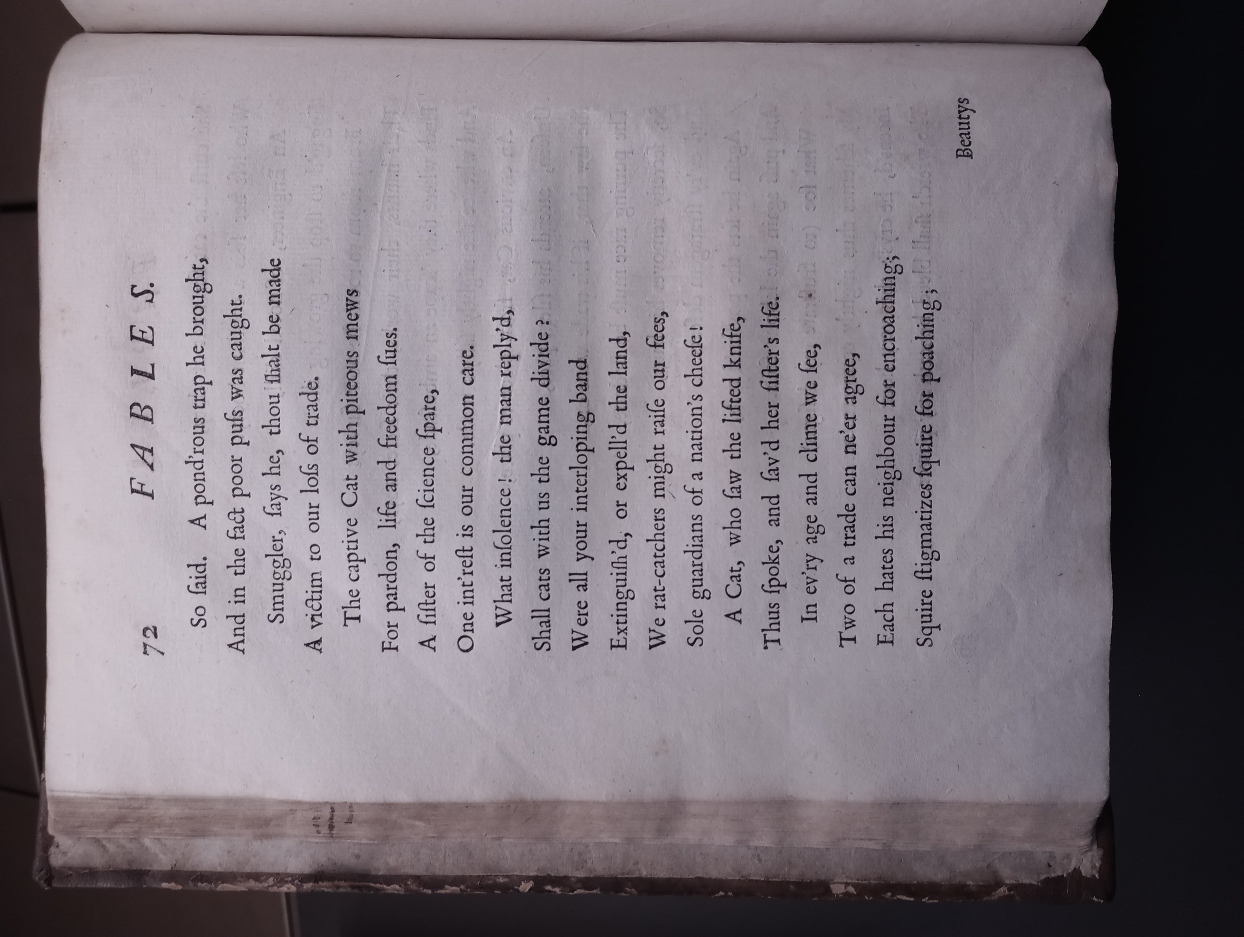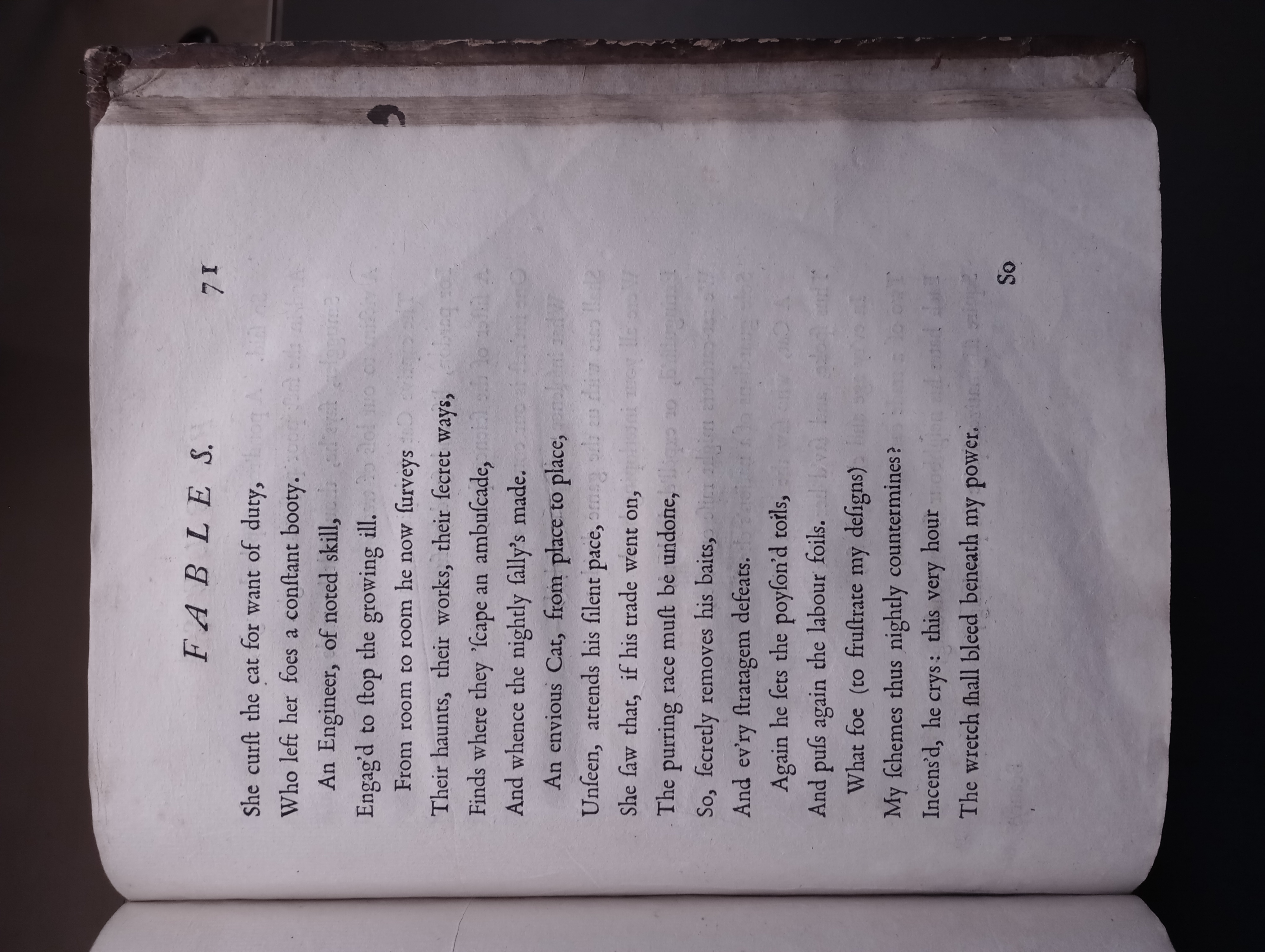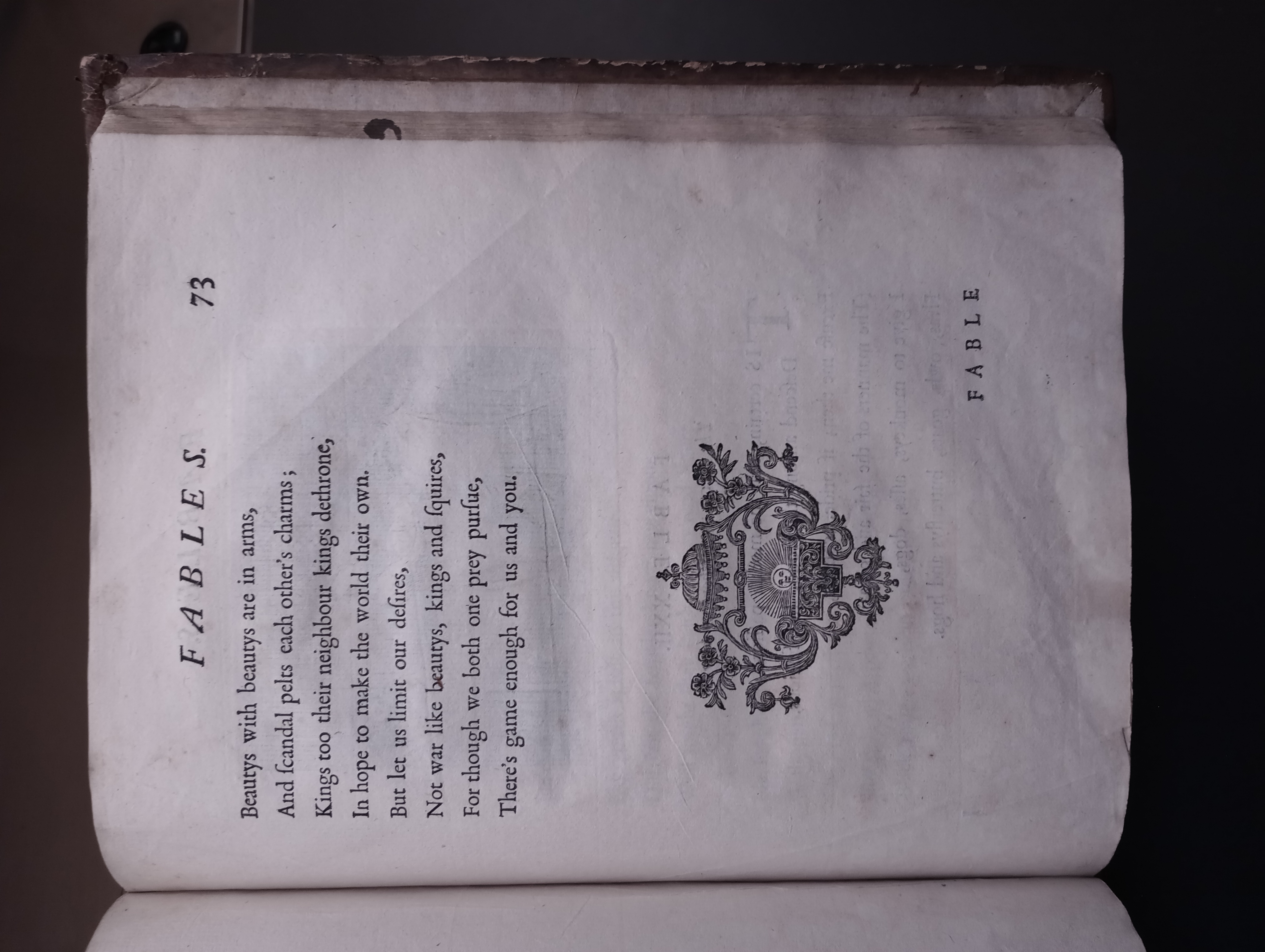 Gay, John, 1685-1732. FABLES. By Mr. GAY. London: Printed for J. Tonson and J. Watts, MDCCXXVII., 1727, pp. 70-73. [14],173,[1]p.: ill.; 4°. (ESTC T13818) (Page images digitized from a copy in the Bodleian Library [AA 29 Art.Seld.].)