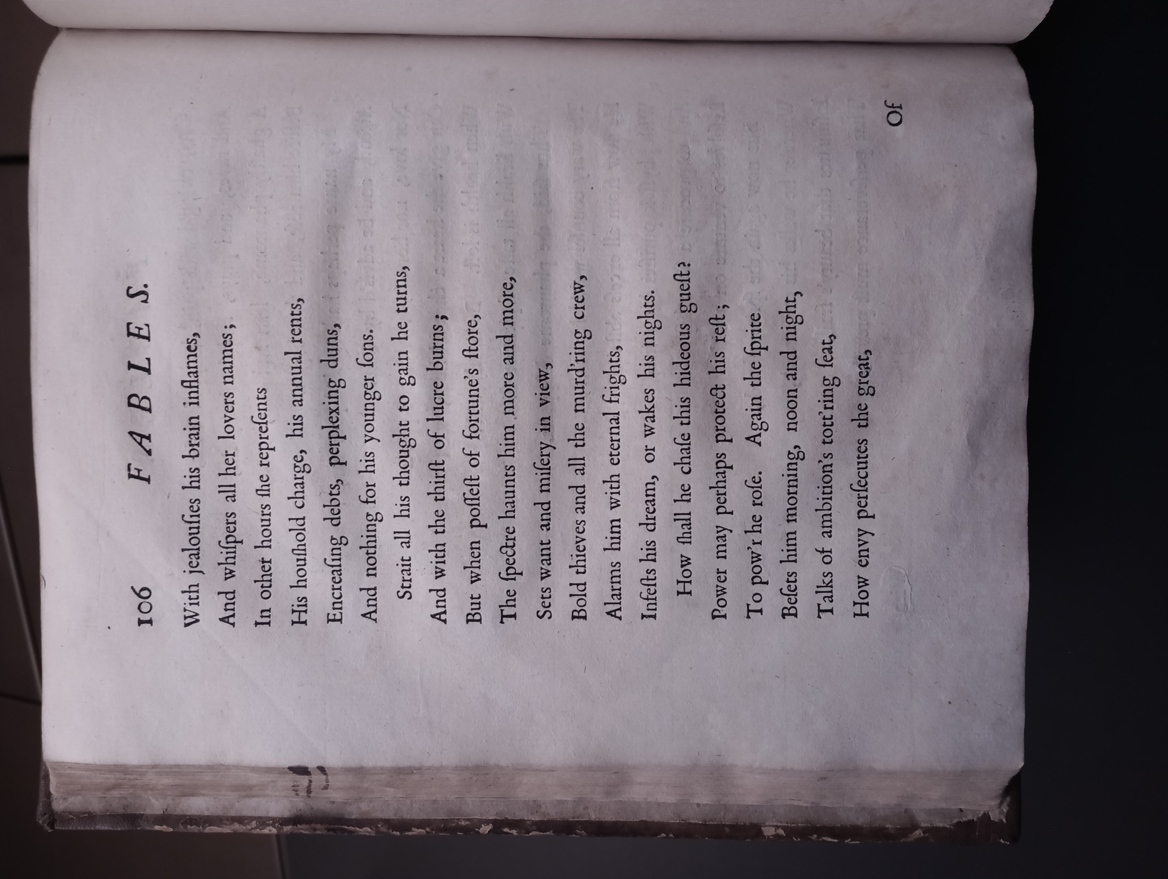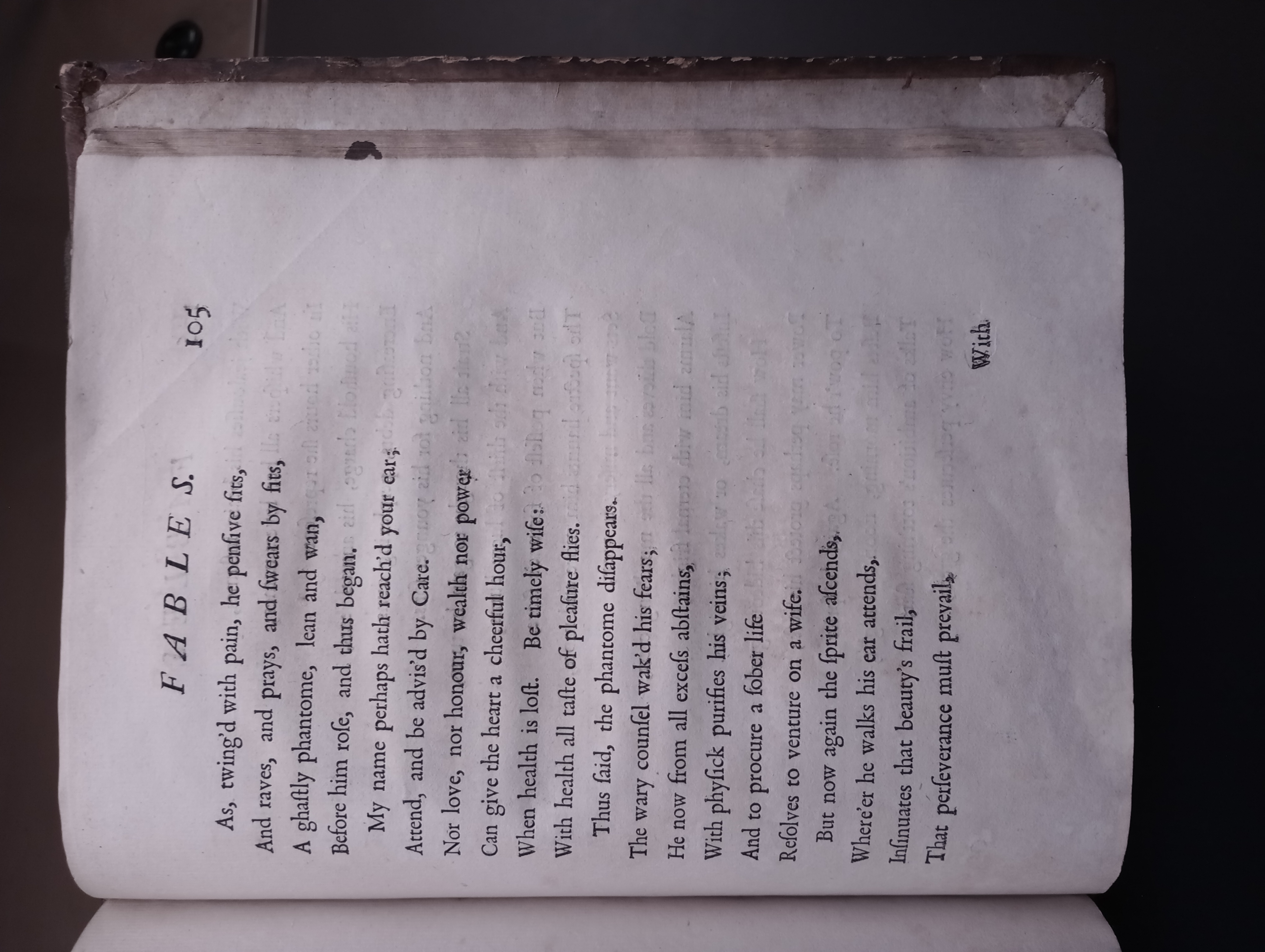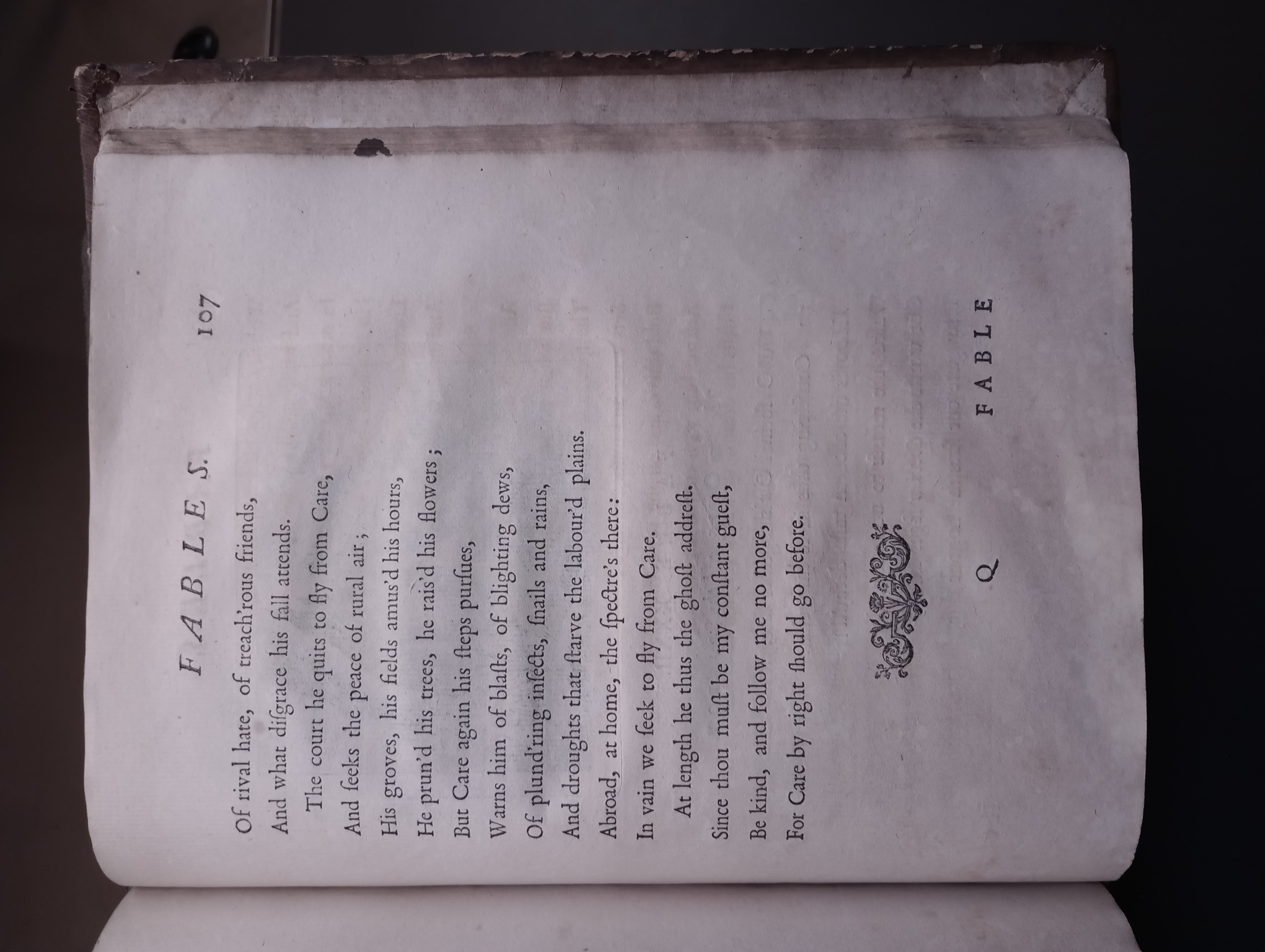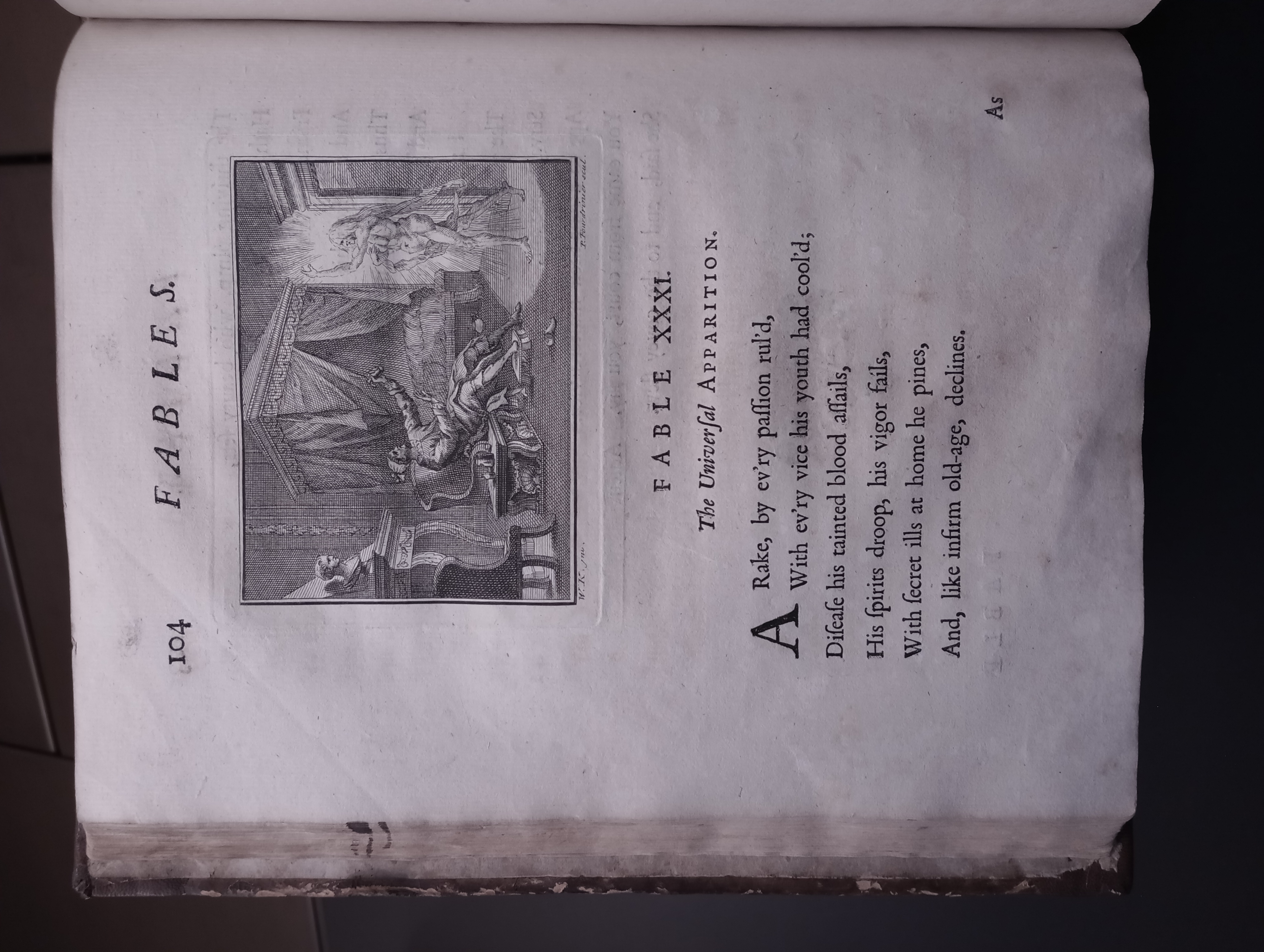 Gay, John, 1685-1732. FABLES. By Mr. GAY. London: Printed for J. Tonson and J. Watts, MDCCXXVII., 1727, pp. 104-107. [14],173,[1]p.: ill.; 4°. (ESTC T13818) (Page images digitized from a copy in the Bodleian Library [AA 29 Art.Seld.].)