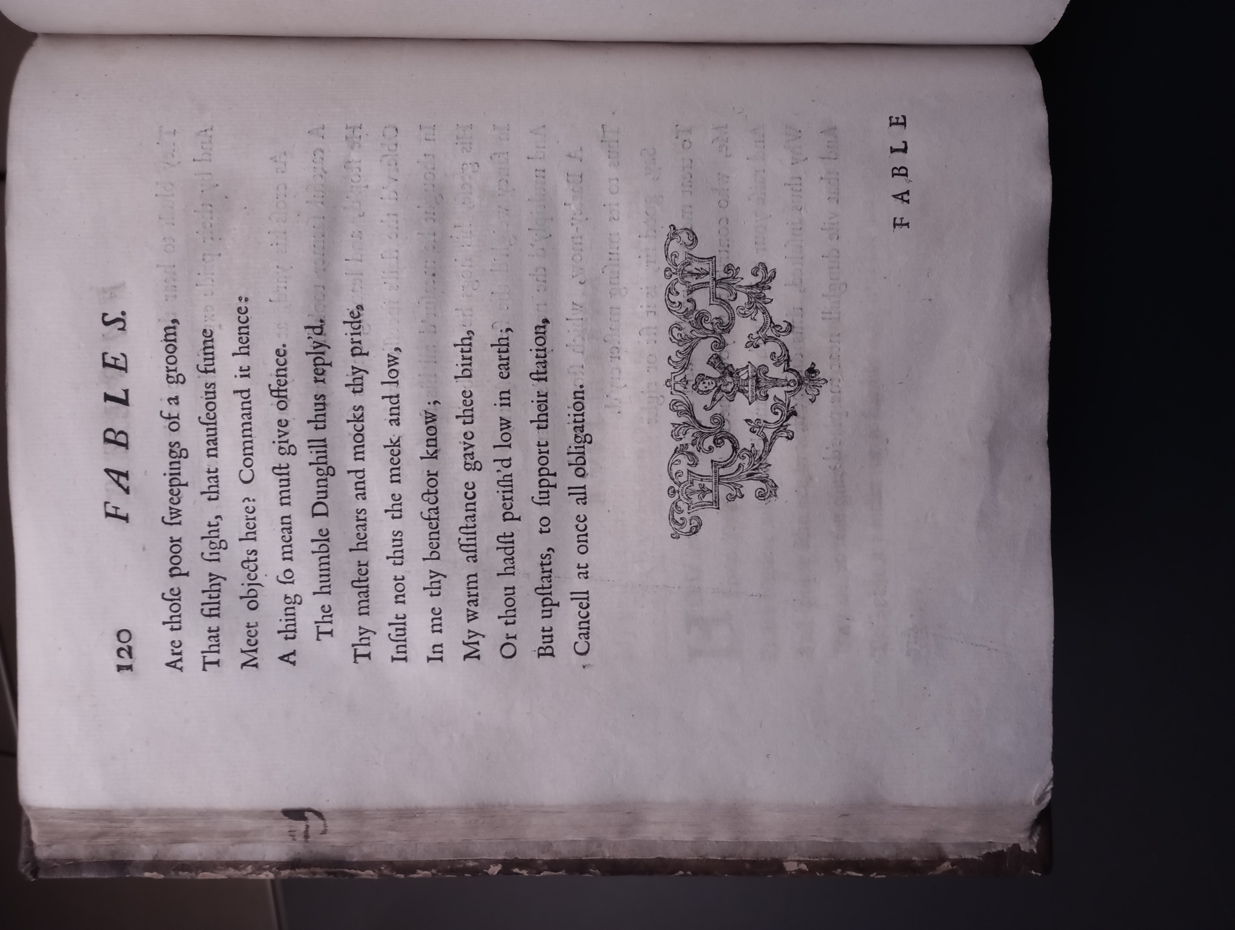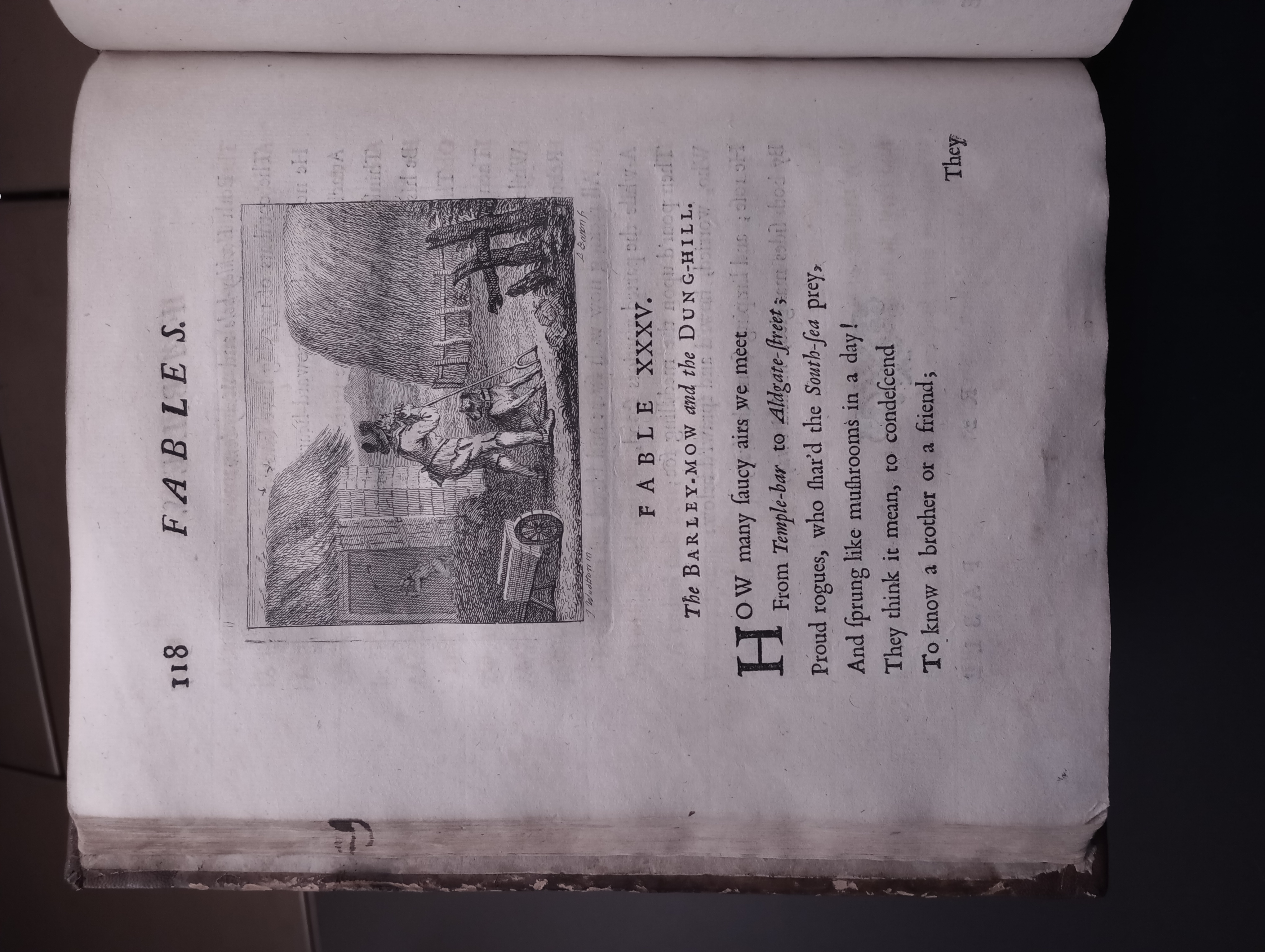 Gay, John, 1685-1732. FABLES. By Mr. GAY. London: Printed for J. Tonson and J. Watts, MDCCXXVII., 1727, pp. 118-120. [14],173,[1]p.: ill.; 4°. (ESTC T13818) (Page images digitized from a copy in the Bodleian Library [AA 29 Art.Seld.].)