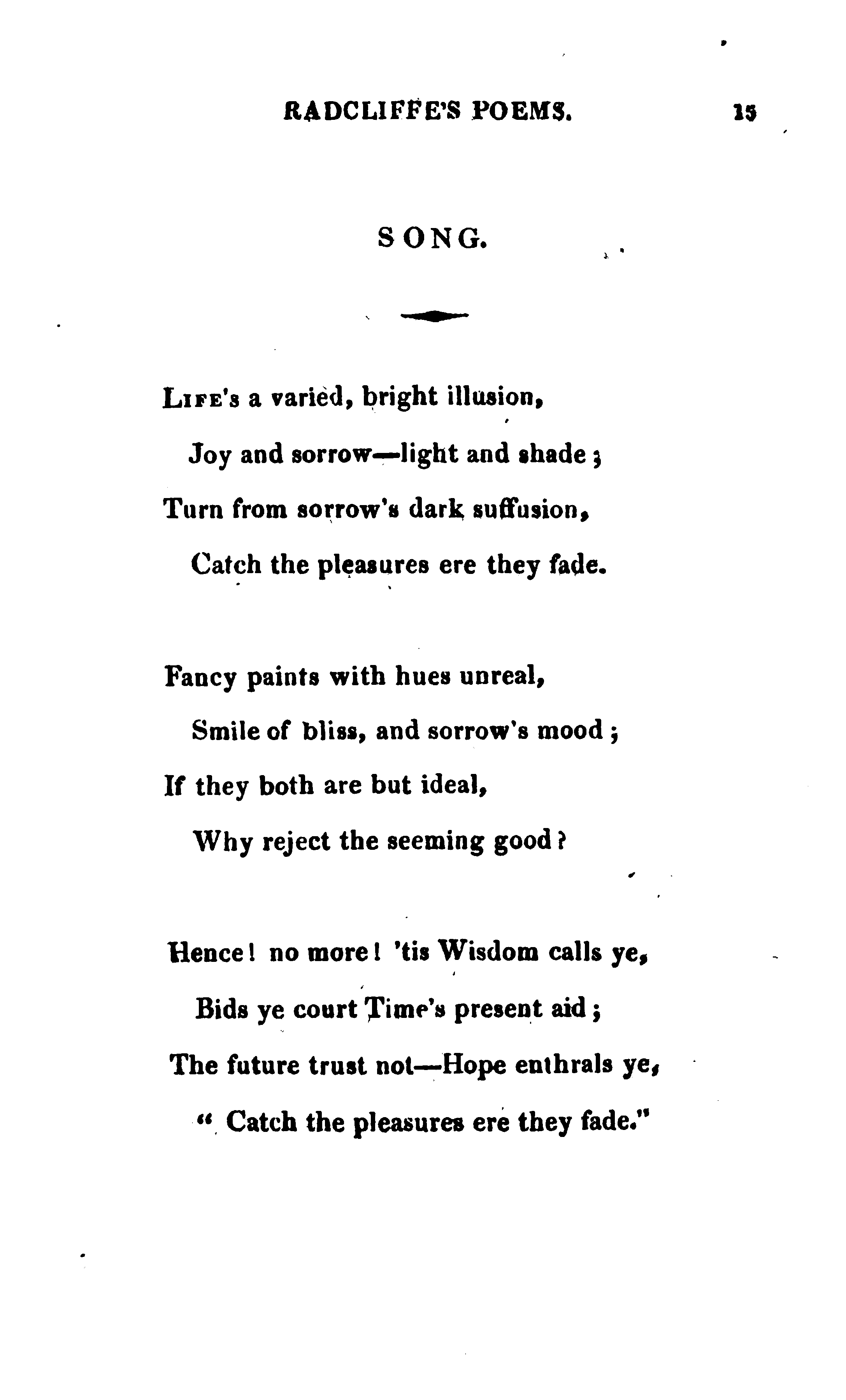 Radcliffe, Ann Ward, 1764-1823. The Poems of Mrs. Ann Radcliffe. London: printed by and for J. Smith, Princes Street, 1816, p. 15. 118p. [Radcliffe's poems only, pp. 1-95] (Page images digitized from a copy held at the National Library of the Netherlands.)