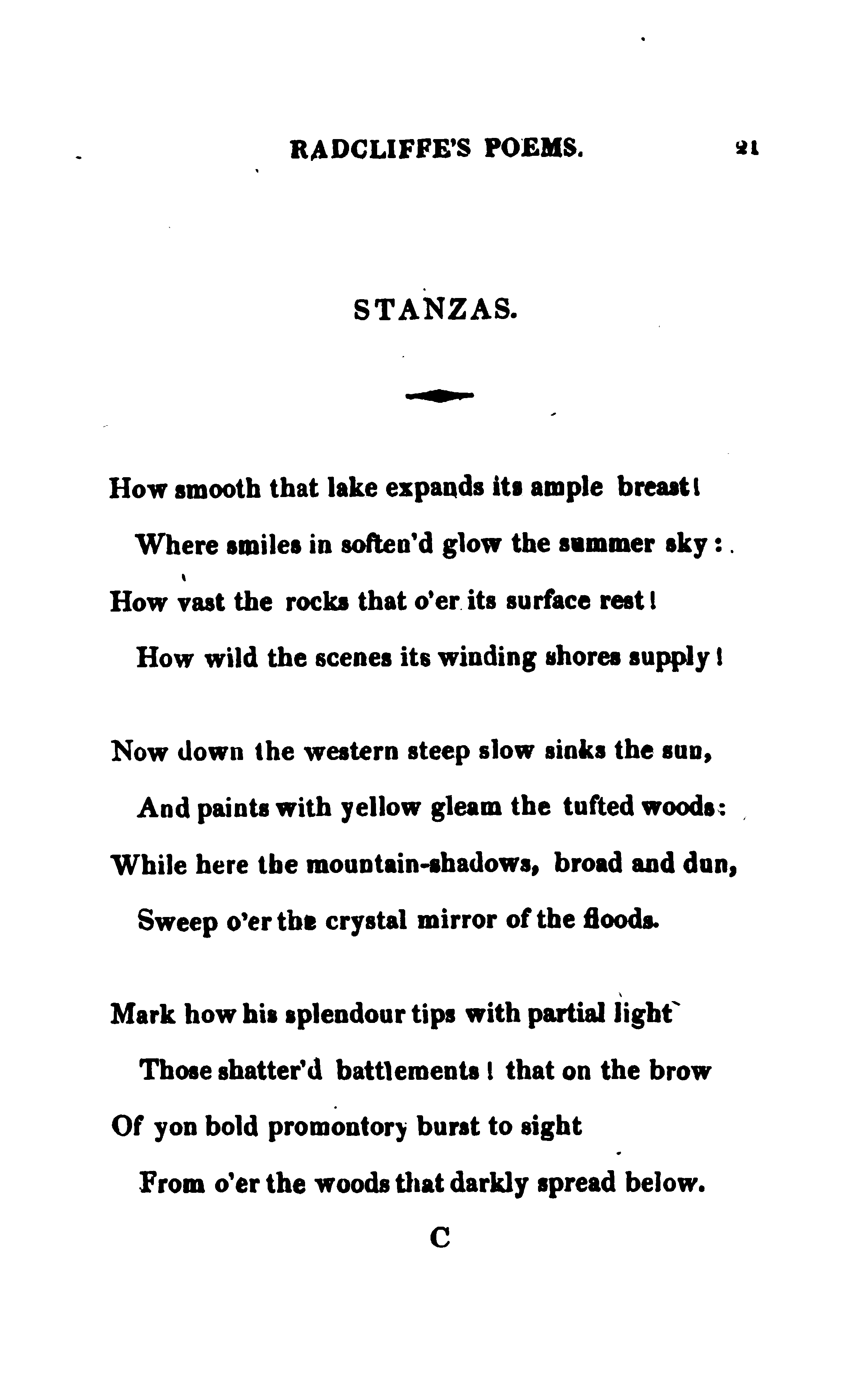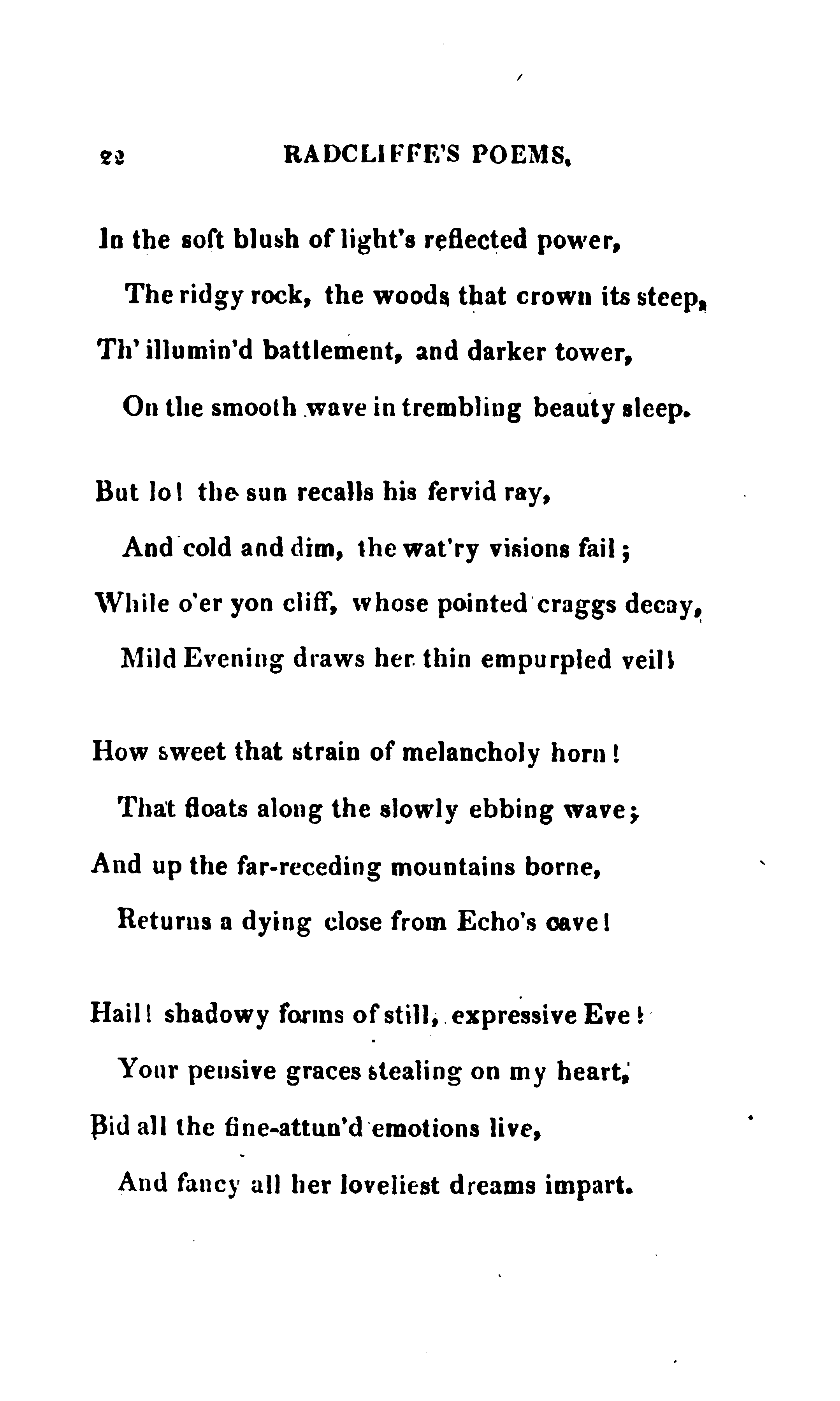 Radcliffe, Ann Ward, 1764-1823. The Poems of Mrs. Ann Radcliffe. London: printed by and for J. Smith, Princes Street, 1816, pp. 21-22. 118p. [Radcliffe's poems only, pp. 1-95] (Page images digitized from a copy held at the National Library of the Netherlands.)