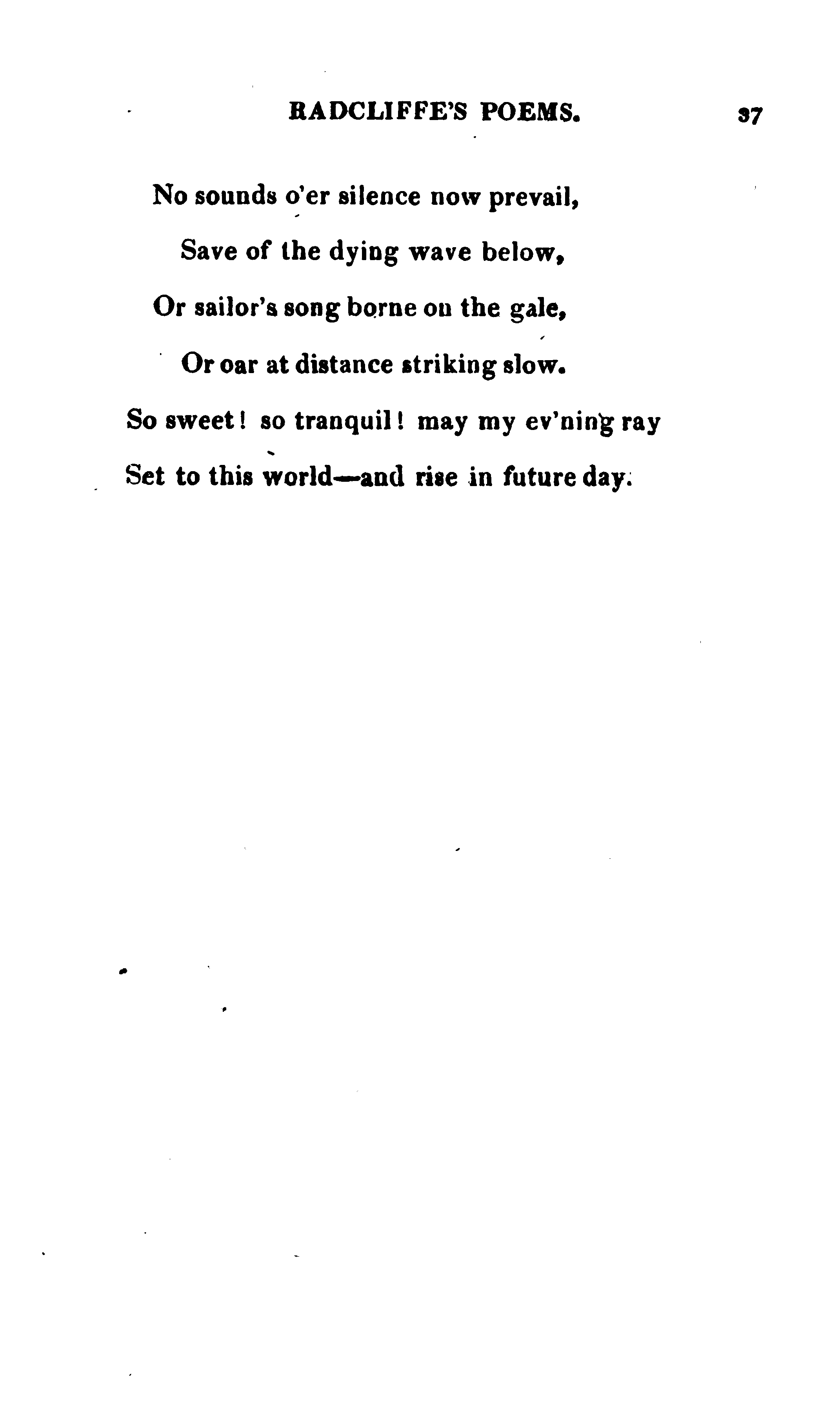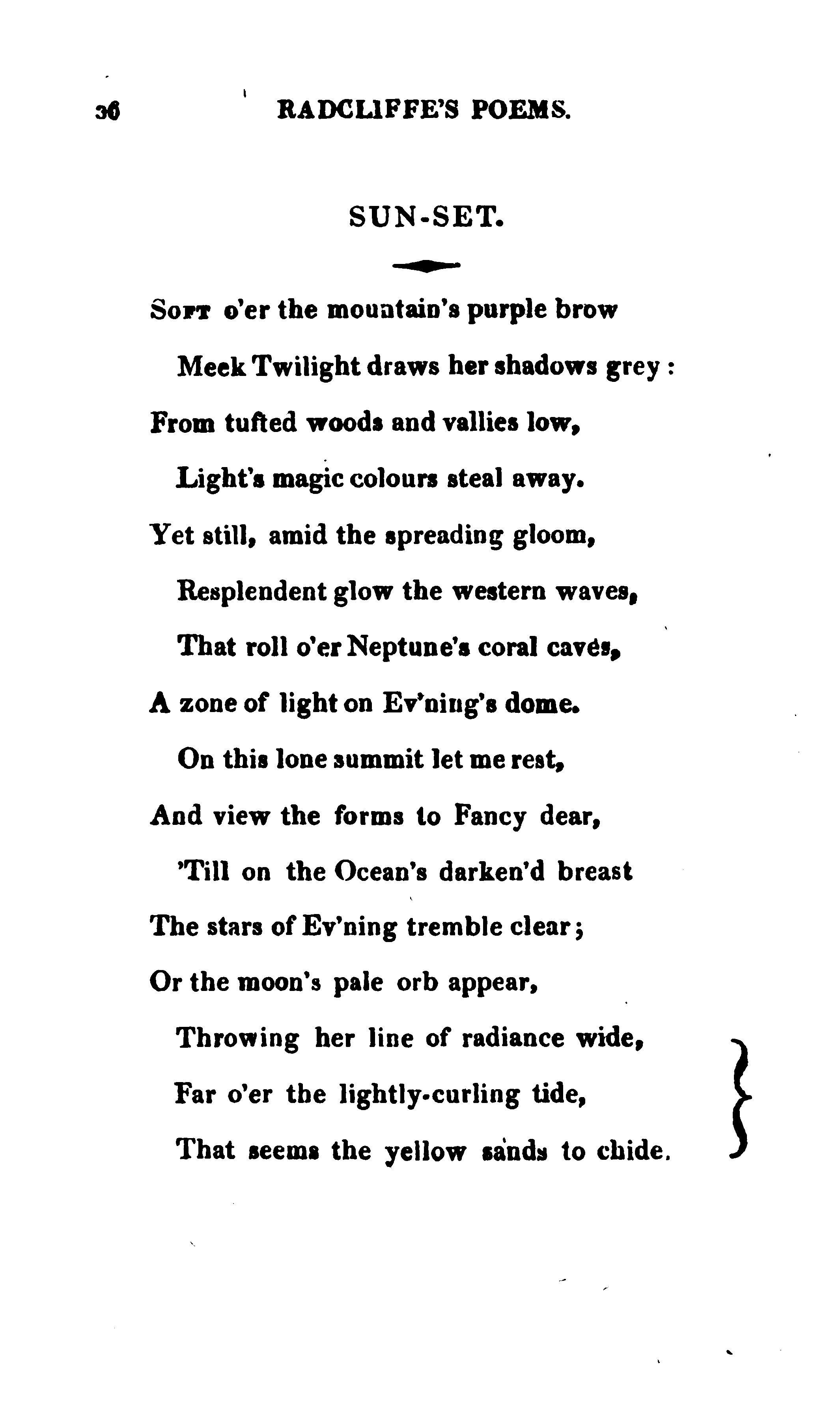 Radcliffe, Ann Ward, 1764-1823. The Poems of Mrs. Ann Radcliffe. London: printed by and for J. Smith, Princes Street, 1816, pp. 36-37. 118p. [Radcliffe's poems only, pp. 1-95] (Page images digitized from a copy held at the National Library of the Netherlands.)