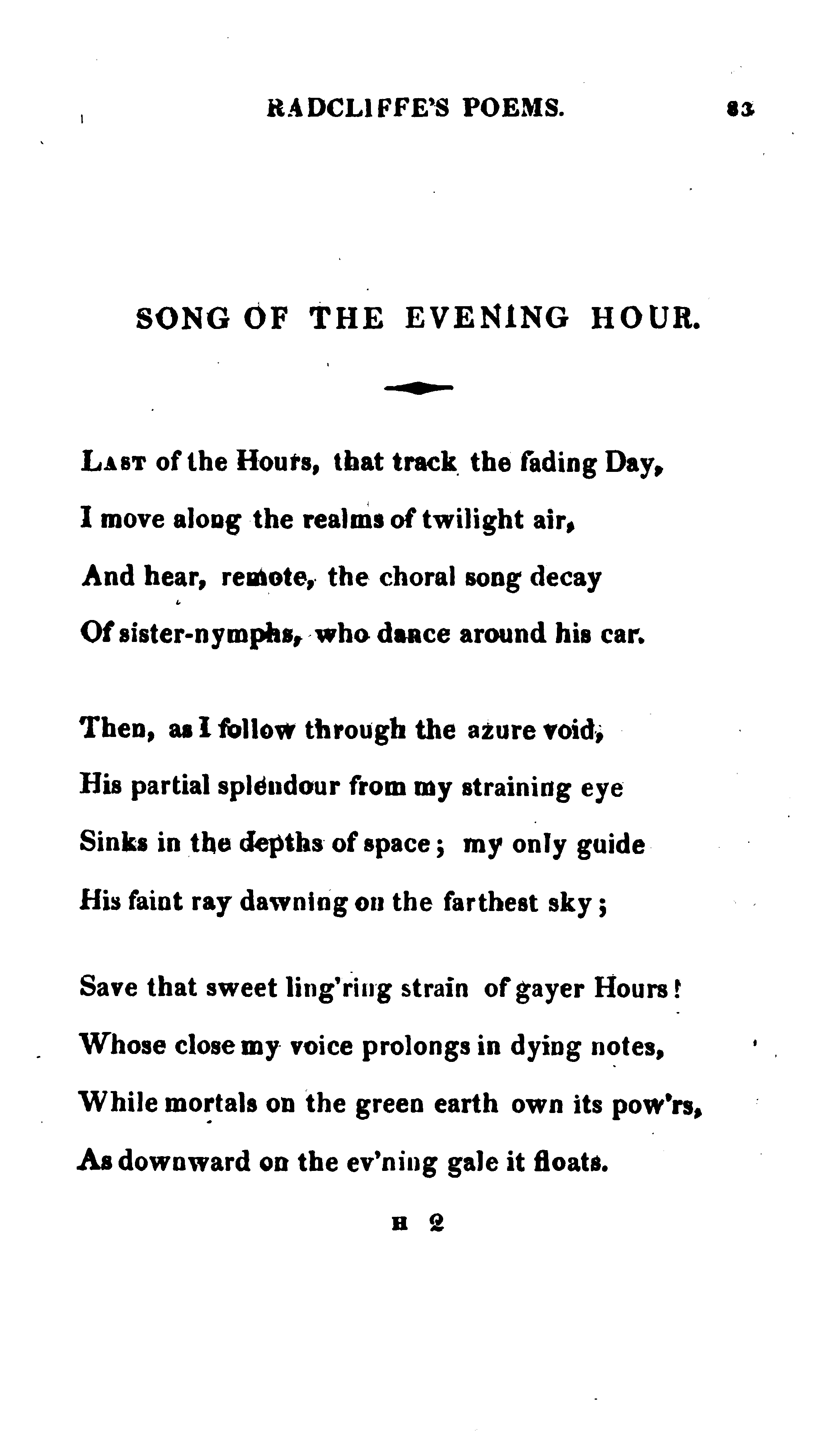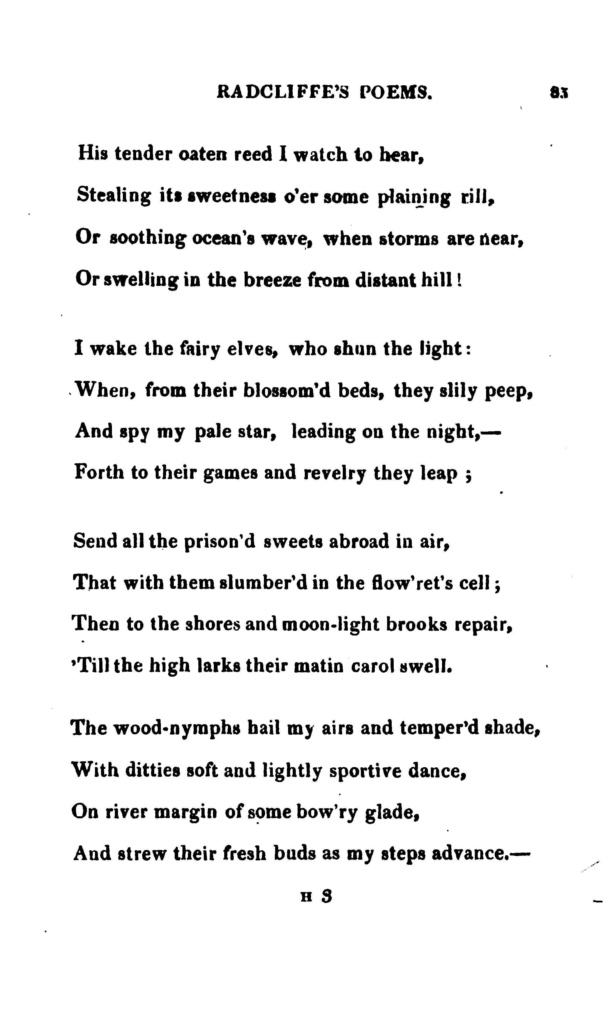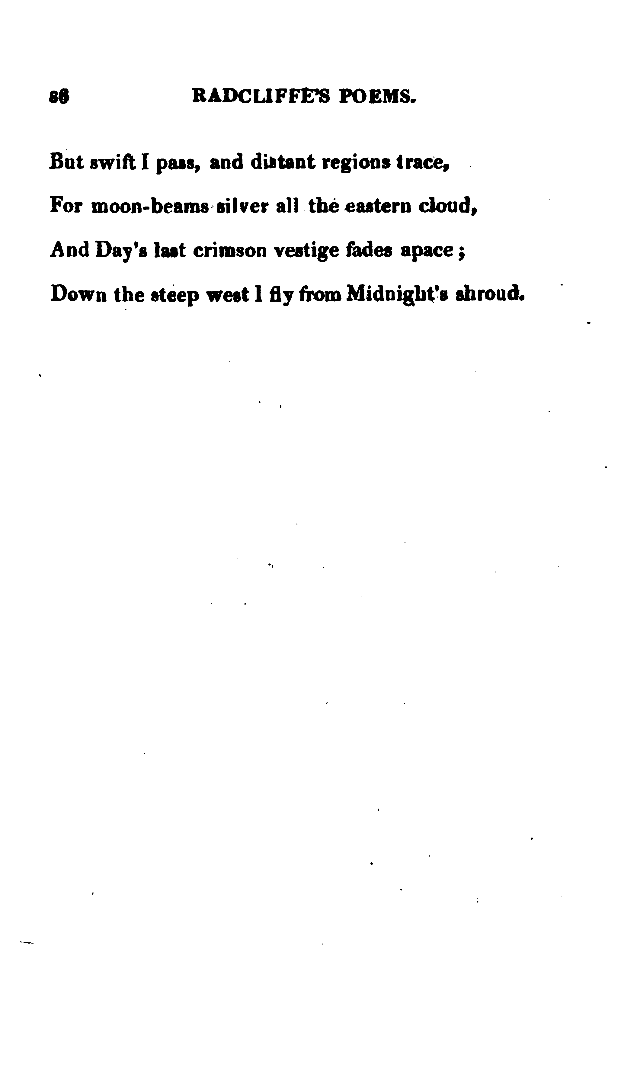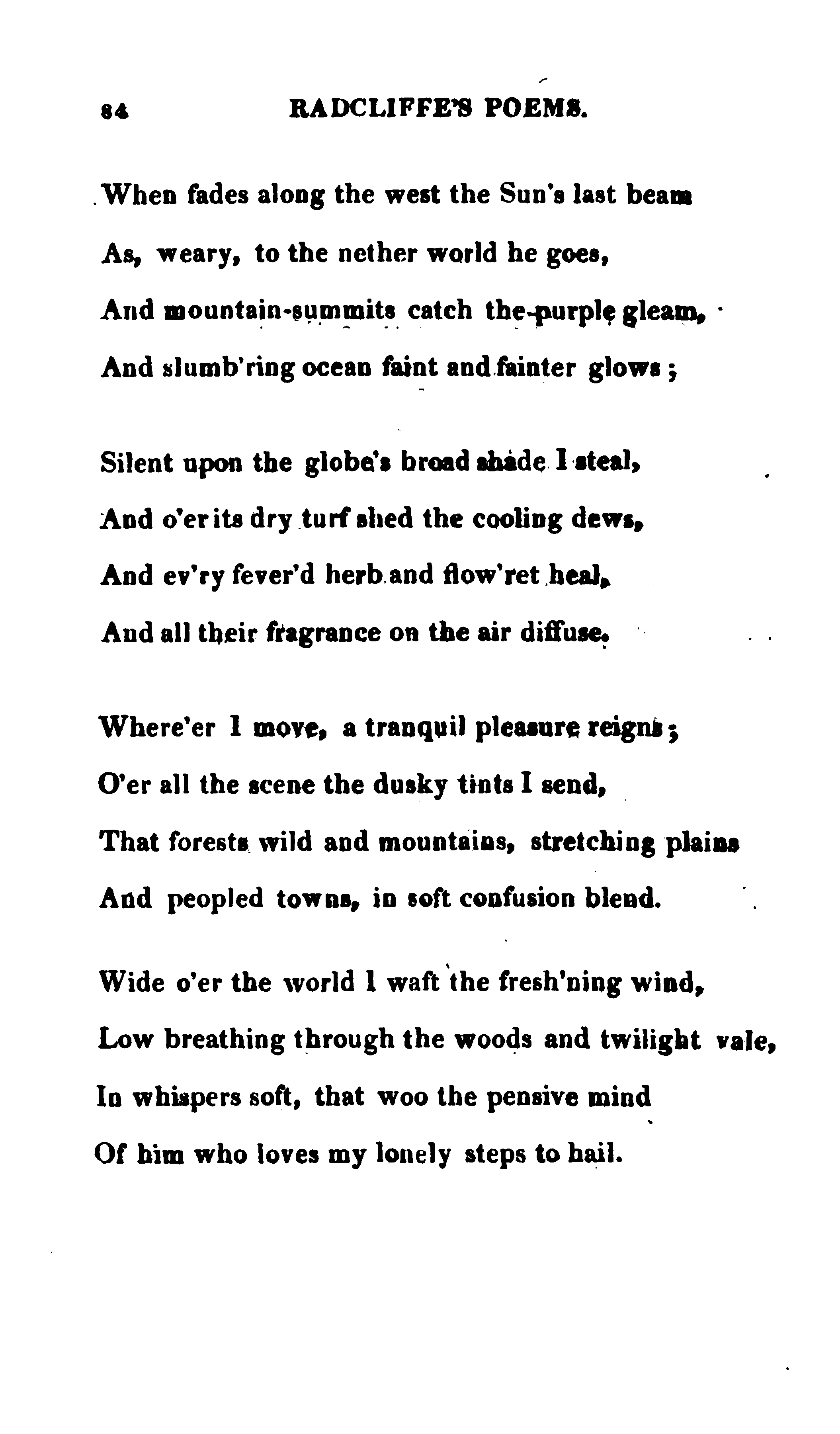 Radcliffe, Ann Ward, 1764-1823. The Poems of Mrs. Ann Radcliffe. London: printed by and for J. Smith, Princes Street, 1816, pp. 83-86. 118p. [Radcliffe's poems only, pp. 1-95] (Page images digitized from a copy held at the National Library of the Netherlands.)
