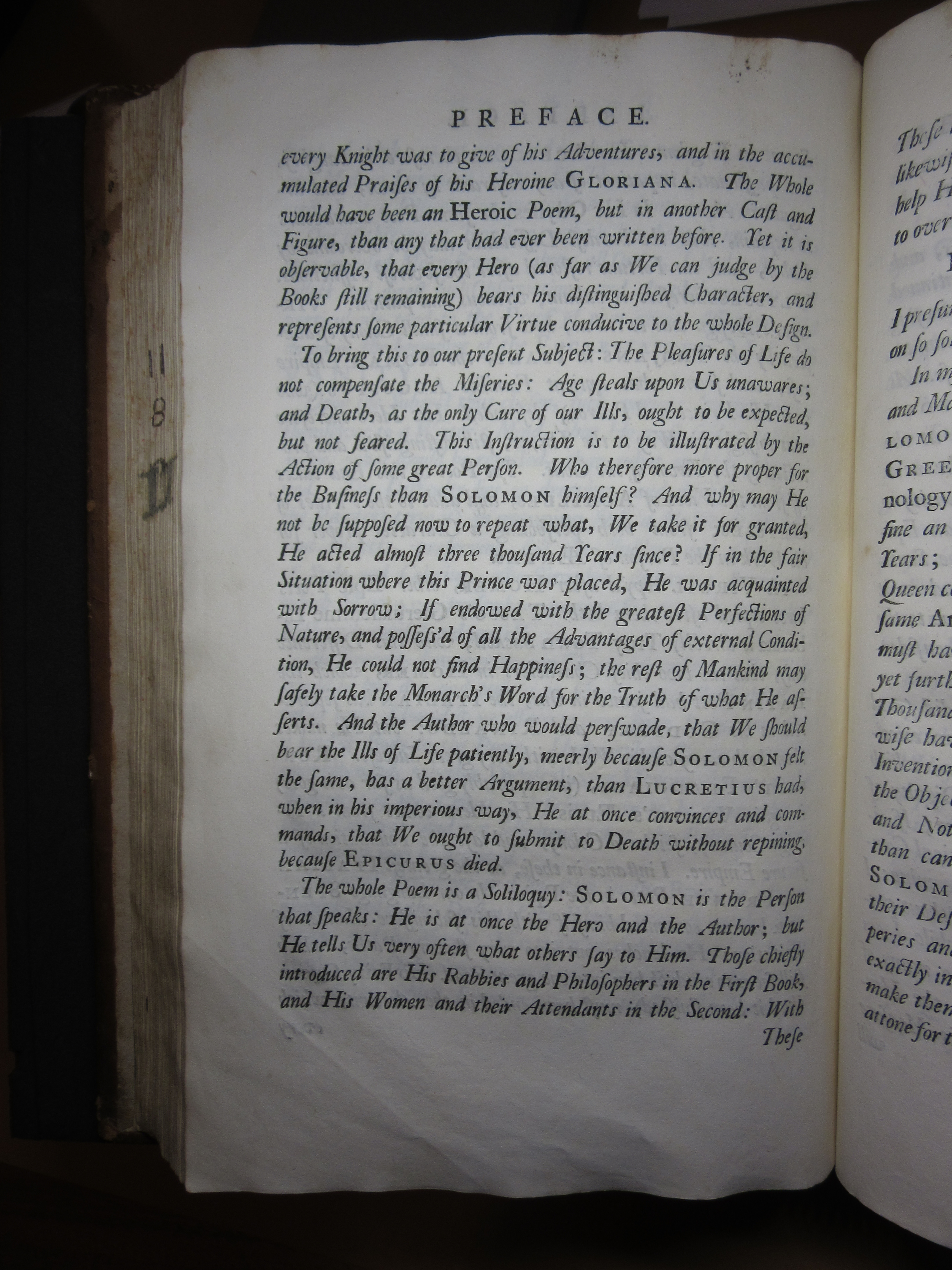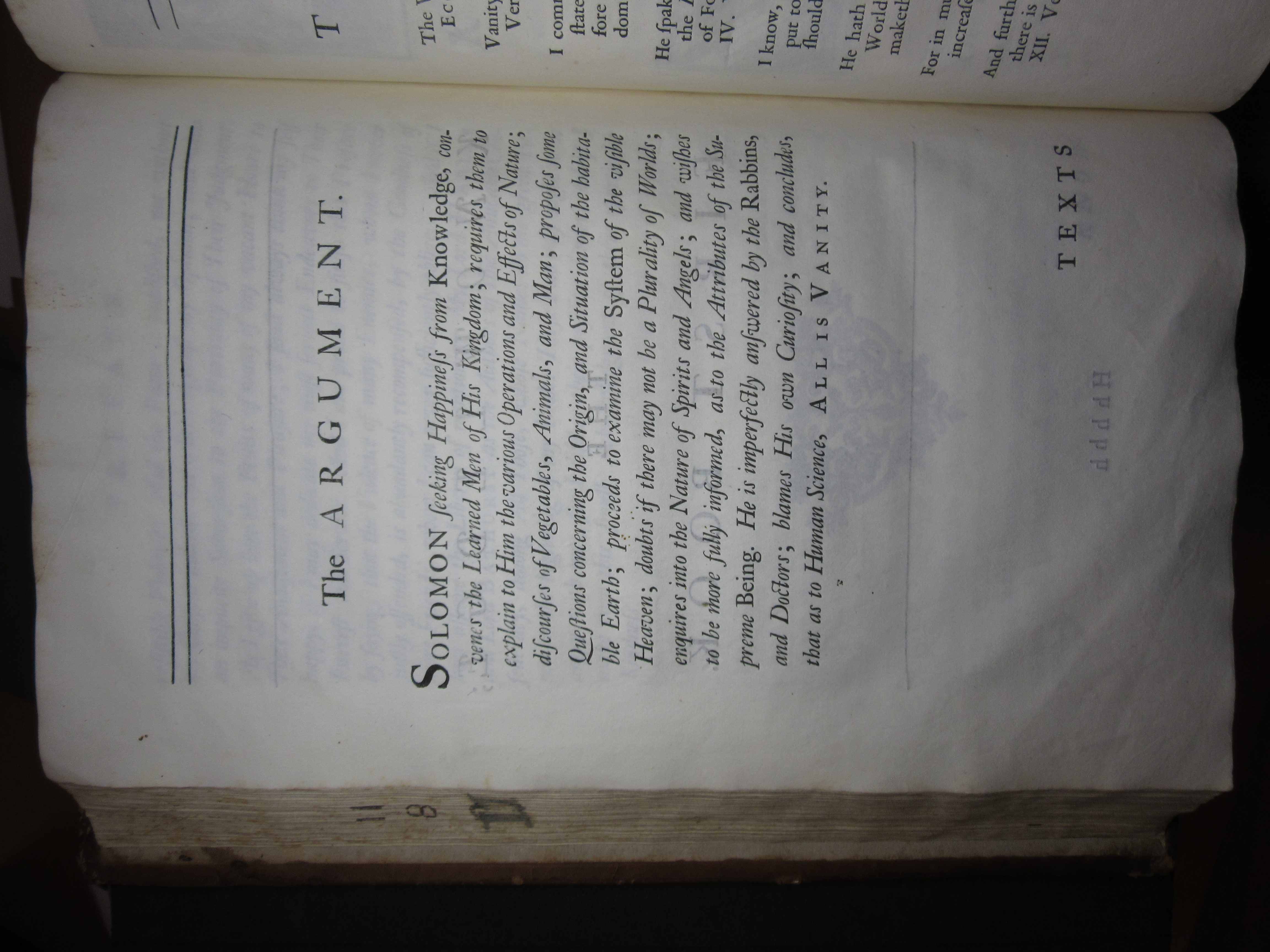 Solomon seeking Happiness from Knowledge, convenes the Learned Men of His Kingdom; requires them to explain to Him the various Operations and Effects of Nature; discourses of Vegetables, Animals, and Man; proposes some Questions concerning the Origin, and Situation of the habitable Earth; proceeds to examine the System of the visible Heaven; doubts if there may not be a Plurality of Worlds; enquires into the Nature of Spirits and Angels; and wishes to be more fully informed, as to the Attributes of the Supreme Being. He is imperfectly answered by the Rabbins, and Doctors; blames His own Curiosity; and concludes, that as to Human Science, All is Vanity.